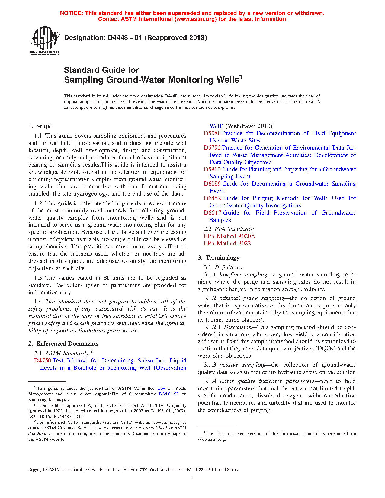 1.2 This guide is only intended to provide a review of many of the most commonly used methods for collecting ground-water quality samples from monitoring wells and is not intended to serve as a ground-water monitoring plan for any specific application. Because of the large and ever increasing number of options available, no single guide can be viewed as comprehensive. The practitioner must make every effort to ensure that the methods used, whether or not they are addressed in this guide, are adequate to satisfy the monitoring objectives at each site.