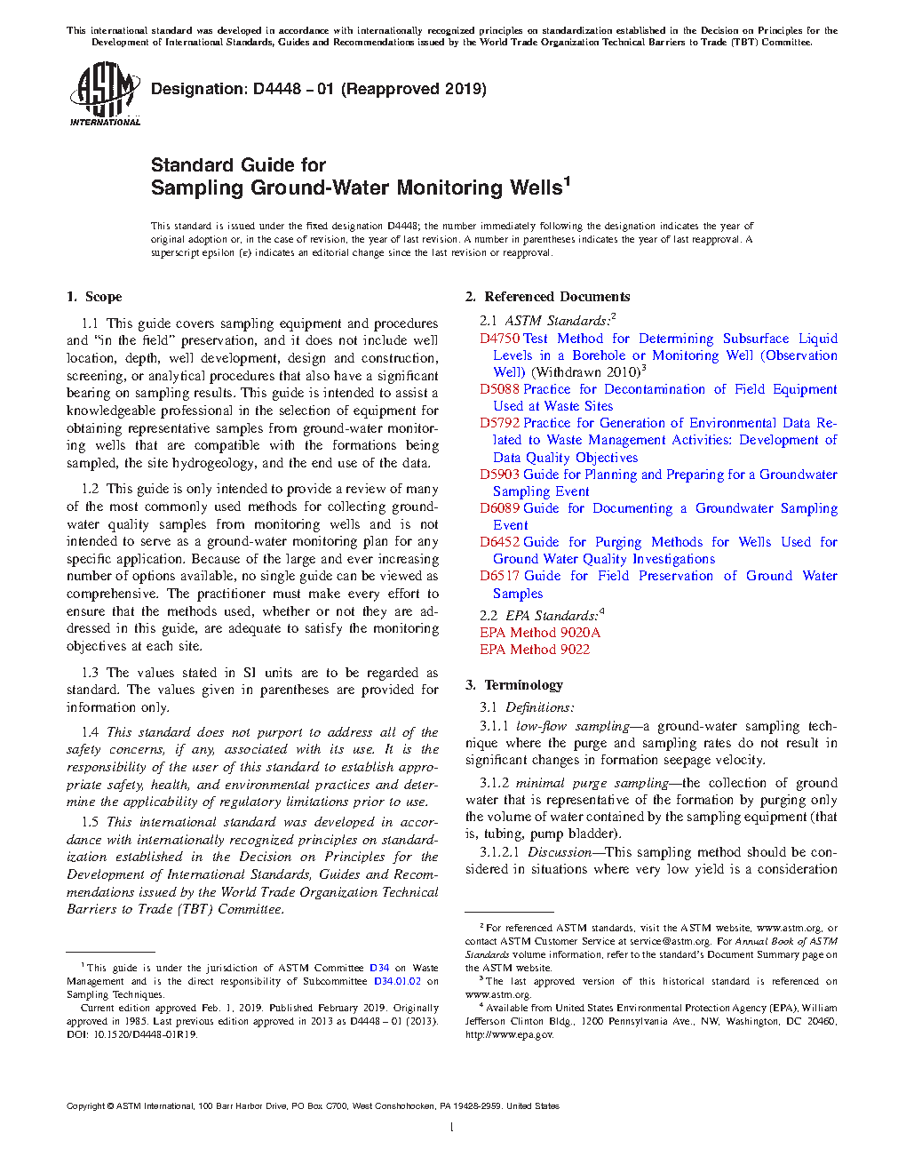 1.1 This guide covers sampling equipment and procedures and “in the field” preservation, and it does not include well location, depth, well development, design and construction, screening, or analytical procedures that also have a significant bearing on sampling results. This guide is intended to assist a knowledgeable professional in the selection of equipment for obtaining representative samples from ground-water monitoring wells that are compatible with the formations being sampled, the site hydrogeology, and the end use of the data.
