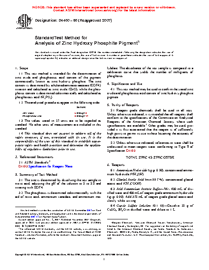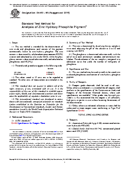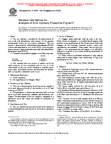 1.1 This test method is intended for the determination of zinc oxide and phosphorous acid content of the pigment commercially known as zinc hydroxy phosphite. The zinc content is determined by ethylenediaminetetraacetate (EDTA) titration and calculated as zinc oxide (ZnO), while the phosphorus content is determined colorimetrically and calculated as phosphorous acid (H3PO3).