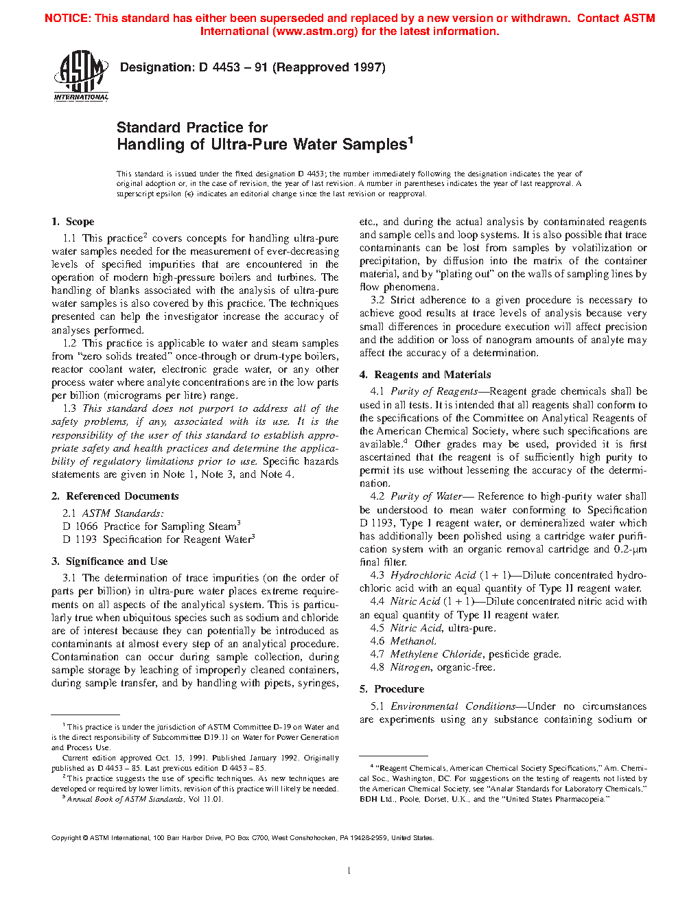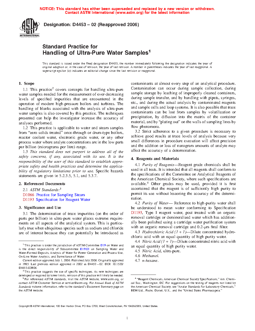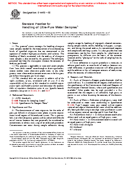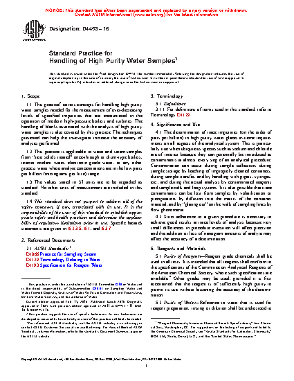 1.1 This practice2 covers concepts for handling high purity water samples needed for the measurement of ever-decreasing levels of specified impurities that are encountered in the operation of modern high-pressure boilers and turbines. The handling of blanks associated with the analysis of high purity water samples is also covered by this practice. The techniques presented can help the investigator increase the accuracy of analyses performed.