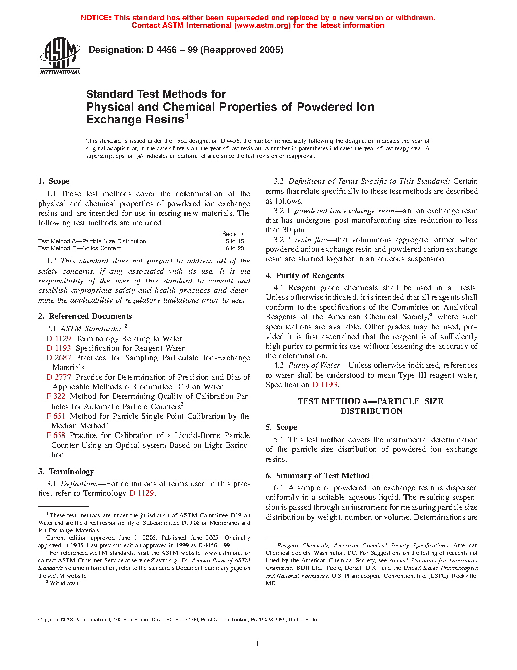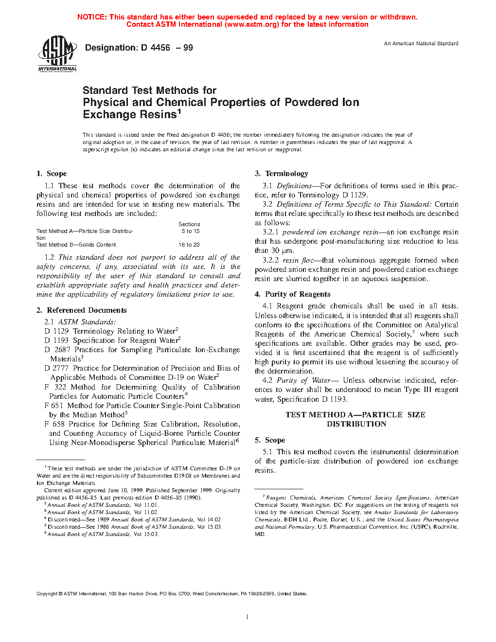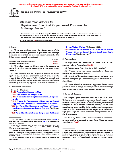 1.1 These test methods cover the determination of the physical and chemical properties of powdered ion exchange resins and are intended for use in testing new materials. The following test methods are included: