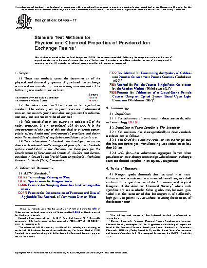 1.1 These test methods cover the determination of the physical and chemical properties of powdered ion exchange resins and are intended for use in testing new materials. The following test methods are included: