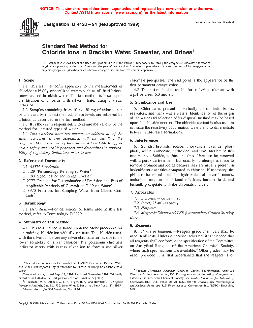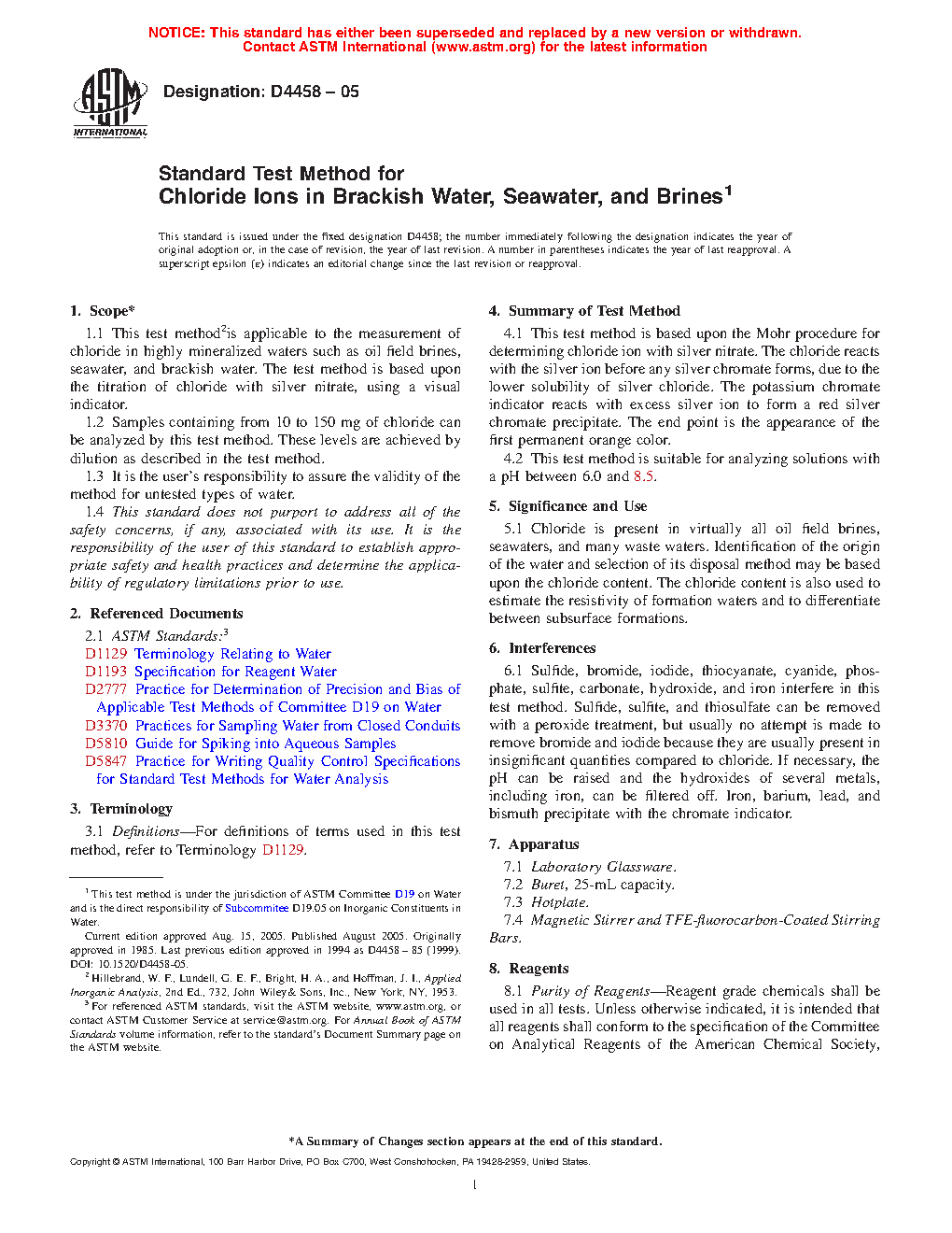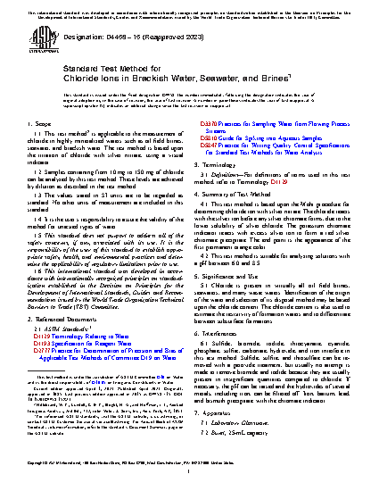 1.1 This test methodis applicable to the measurement of chloride in highly mineralized waters such as oil field brines, seawater, and brackish water. The test method is based upon the titration of chloride with silver nitrate, using a visual indicator.