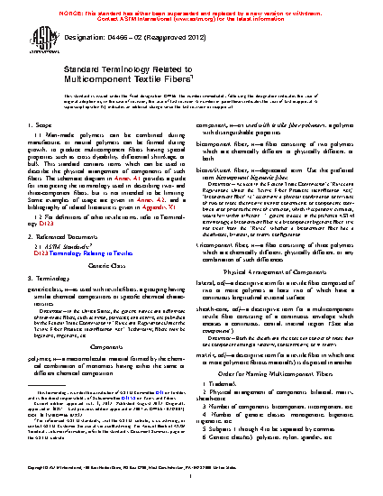 1.1 Man-made polymers can be combined during manufacture, or natural polymers can be formed during growth, to produce multicomponent fibers having special properties such as cross dyeability, differential shrinkage, or bulk. This standard contains terms which can be used to describe the physical arrangement of components of such fibers. The schematic diagram in Annex A1 provides a guide for interpreting the terminology used in describing two- and three-component fibers, but is not intended to be limiting. Some examples of usage are given in Annex A2, and a bibliography of related literature is given in Appendix X1.