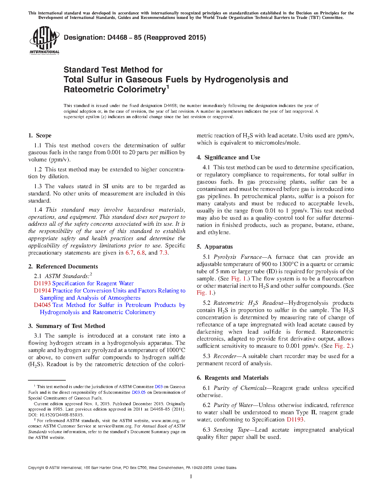 Standard Test Method for Total Sulfur in Gaseous Fuels by Hydrogenolysis and Rateometric Colorimetry