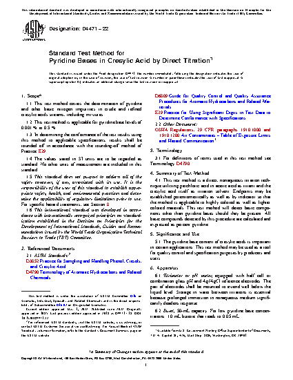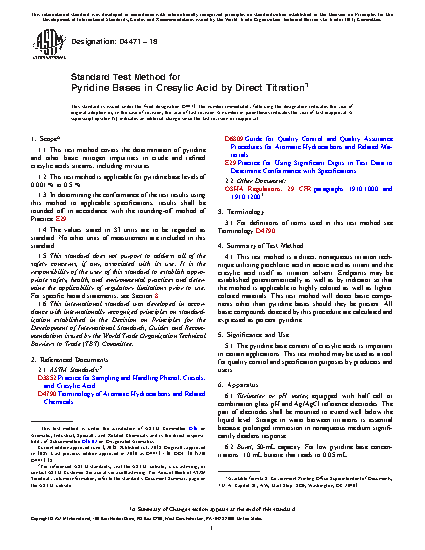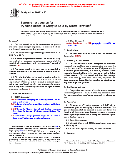 1.1 This test method covers the determination of pyridine and other basic nitrogen impurities in crude and refined cresylic acids streams, including mixtures.