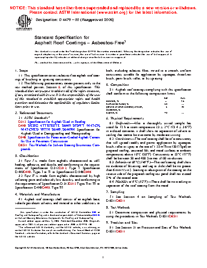 This specification covers the properties and requirements for two types of asbestos-free asphalt roof coatings consisting of an asphalt base, volatile petroleum solvents, and mineral or other stabilizers, or both, mixed to a smooth, uniform consistency suitable for application by squeegee, three-knot brush, paint brush, roller, or by spraying. Type I is made from asphalts characterized as self-healing, adhesive, and ductile, while Type II is made from asphalts characterized by high softening point and relatively low ductility. The coatings shall conform to specified composition limits for water, nonvolatile matter, minerals and/or other stabilizers, and bitumen (asphalt). They shall also meet physical requirements as to uniformity, consistency, and pliability and behavior at given temperatures.