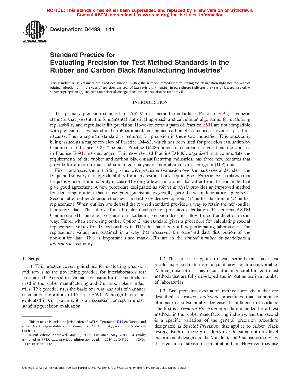 1.3 Two precision evaluation methods are given that are described as robust statistical procedures that attempt to eliminate or substantially decrease the influence of outliers. The first is a General Precision procedure intended for all test methods in the rubber manufacturing industry, and the second is a specific variation of the general precision procedure designated as Special Precision, that applies to carbon black testing. Both of these procedures use the same uniform level experimental design and the Mandel h and k statistics to review the precision database for potential outliers. However, they use slight modifications in the procedure for rejecting incompatible data values as outliers. The Special Precision procedure is specific as to the number of replicates per database cell or material-laboratory combination.