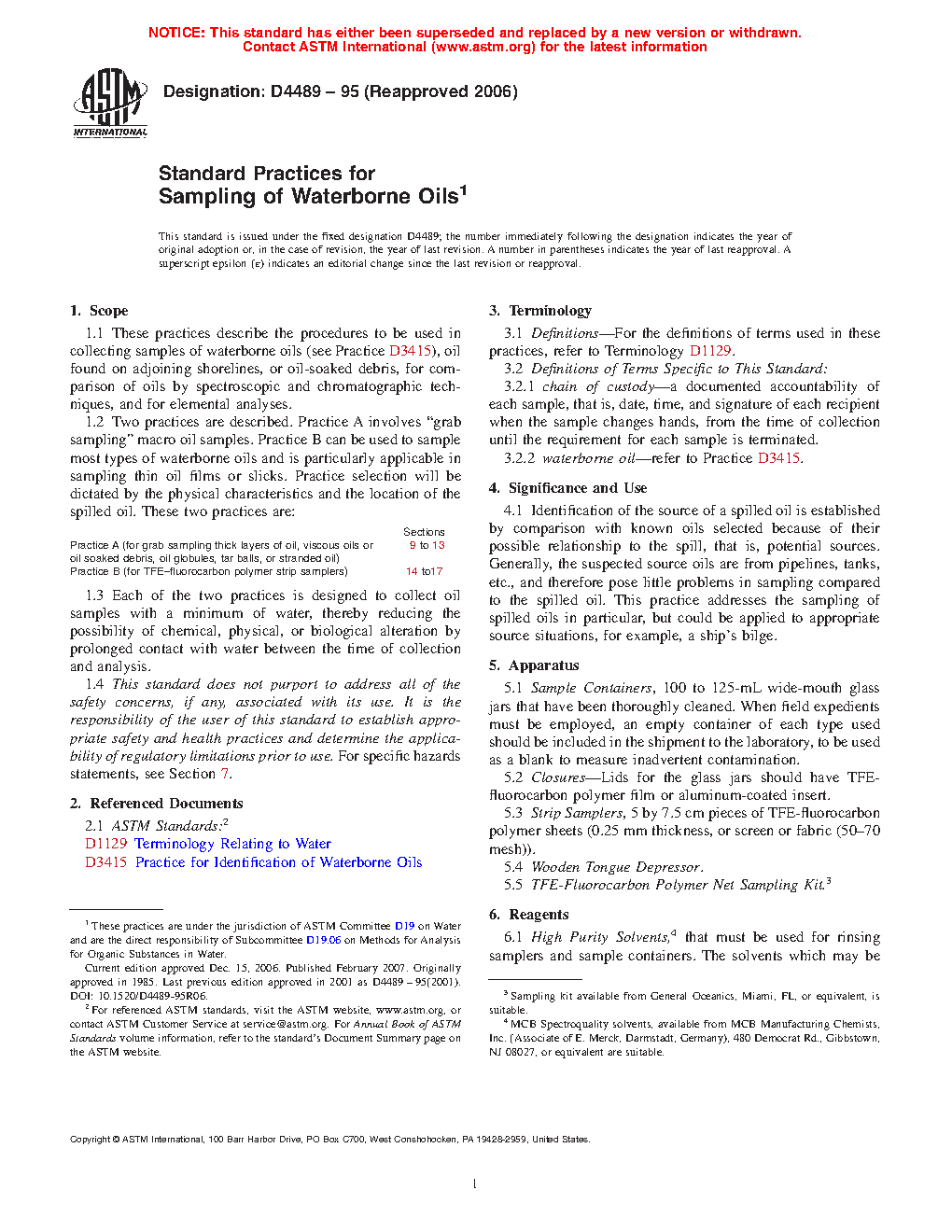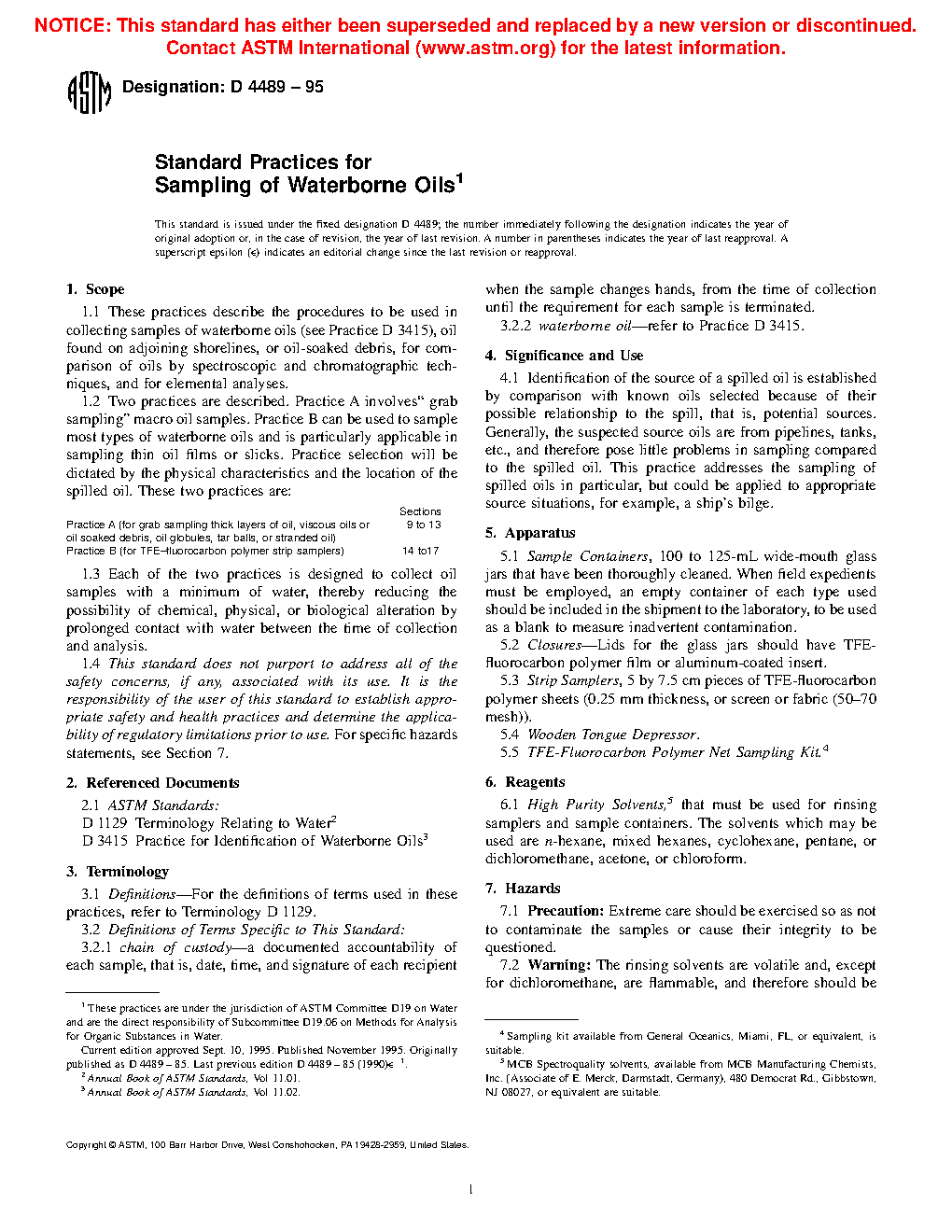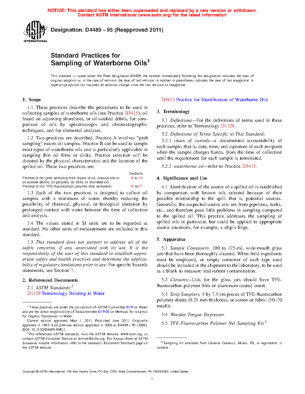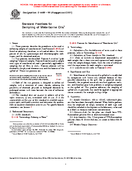 1.2 Two practices are described. Practice A involves “grab sampling” macro oil samples. Practice B can be used to sample most types of waterborne oils and is particularly applicable in sampling thin oil films or slicks. Practice selection will be dictated by the physical characteristics and the location of the spilled oil. These two practices are: