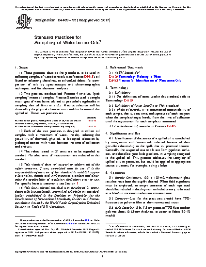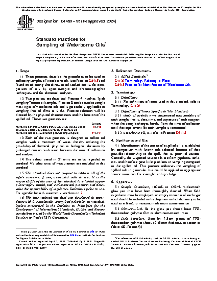 1.1 These practices describe the procedures to be used in collecting samples of waterborne oils (see Practice D3415), oil found on adjoining shorelines, or oil-soaked debris, for comparison of oils by spectroscopic and chromatographic techniques, and for elemental analyses.