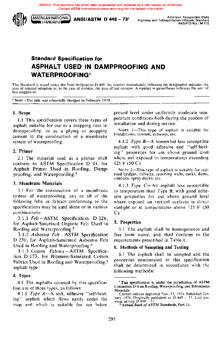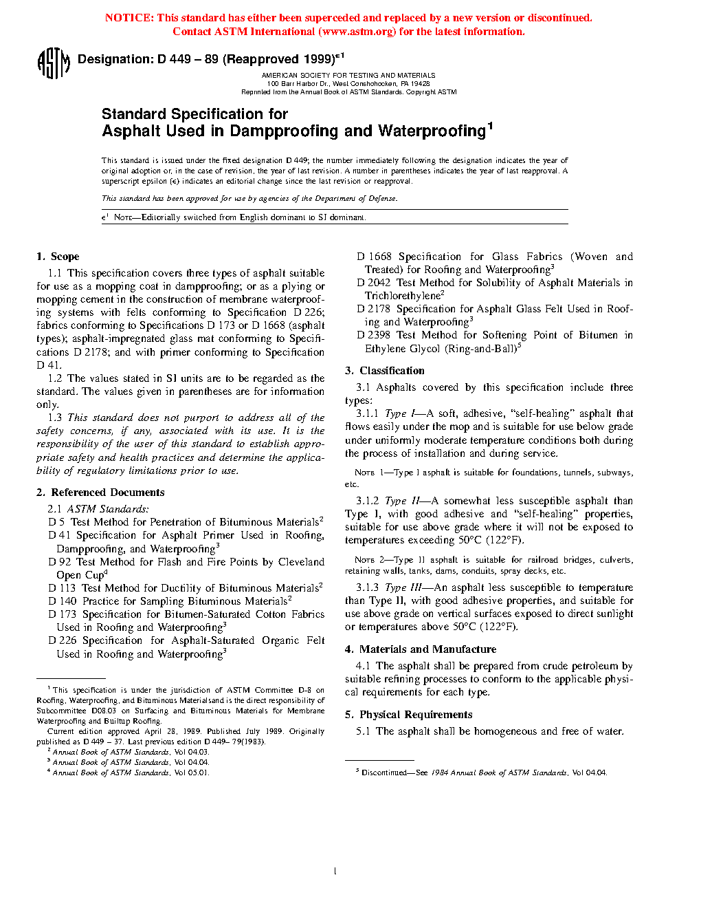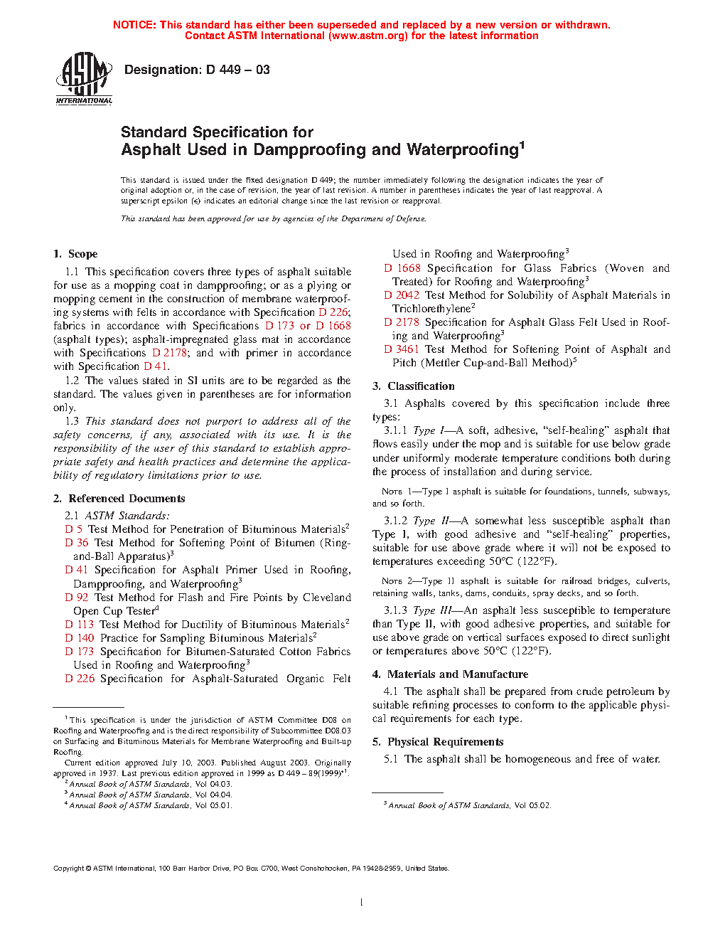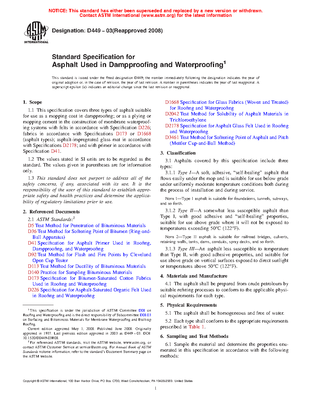 Standard Specification for Asphalt Used In Dampproofing And Waterproofing