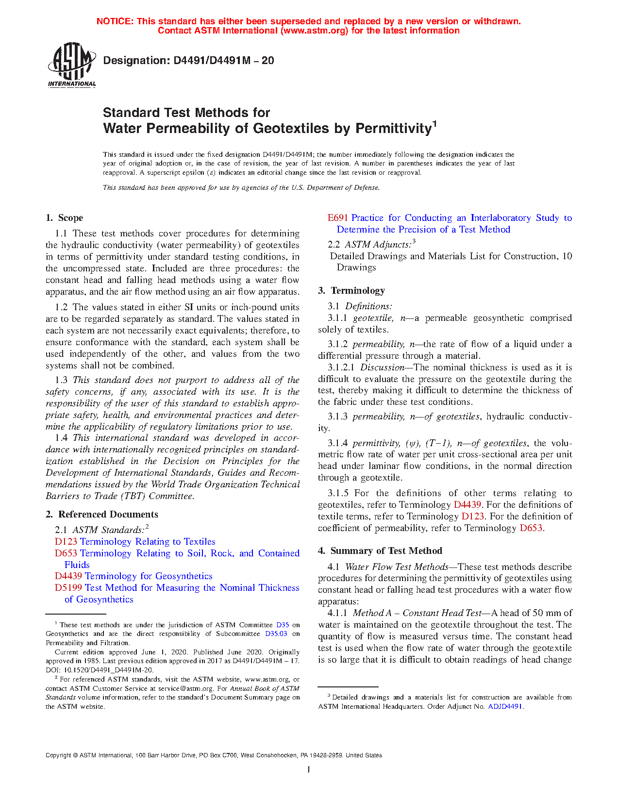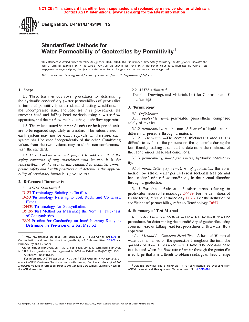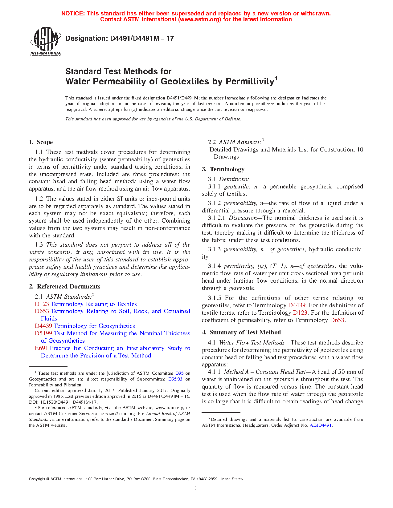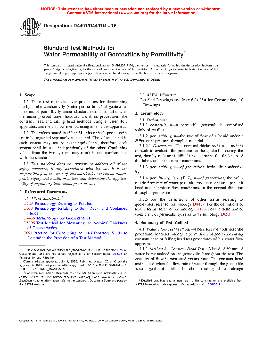 1.1 These test methods cover procedures for determining the hydraulic conductivity (water permeability) of geotextiles in terms of permittivity under standard testing conditions, in the uncompressed state. Included are three procedures: the constant head and falling head methods using a water flow apparatus, and the air flow method using an air flow apparatus.