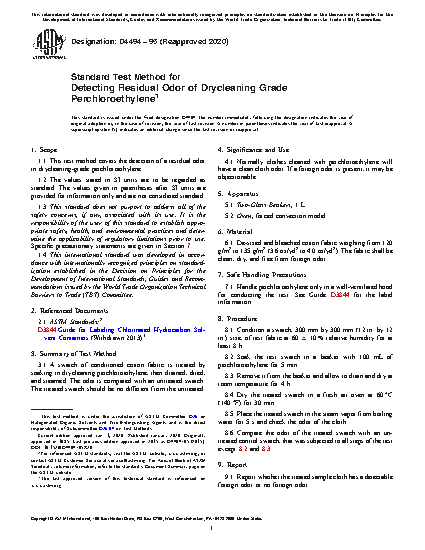 1.1 This test method covers the detection of a residual odor in drycleaning-grade perchloroethylene.