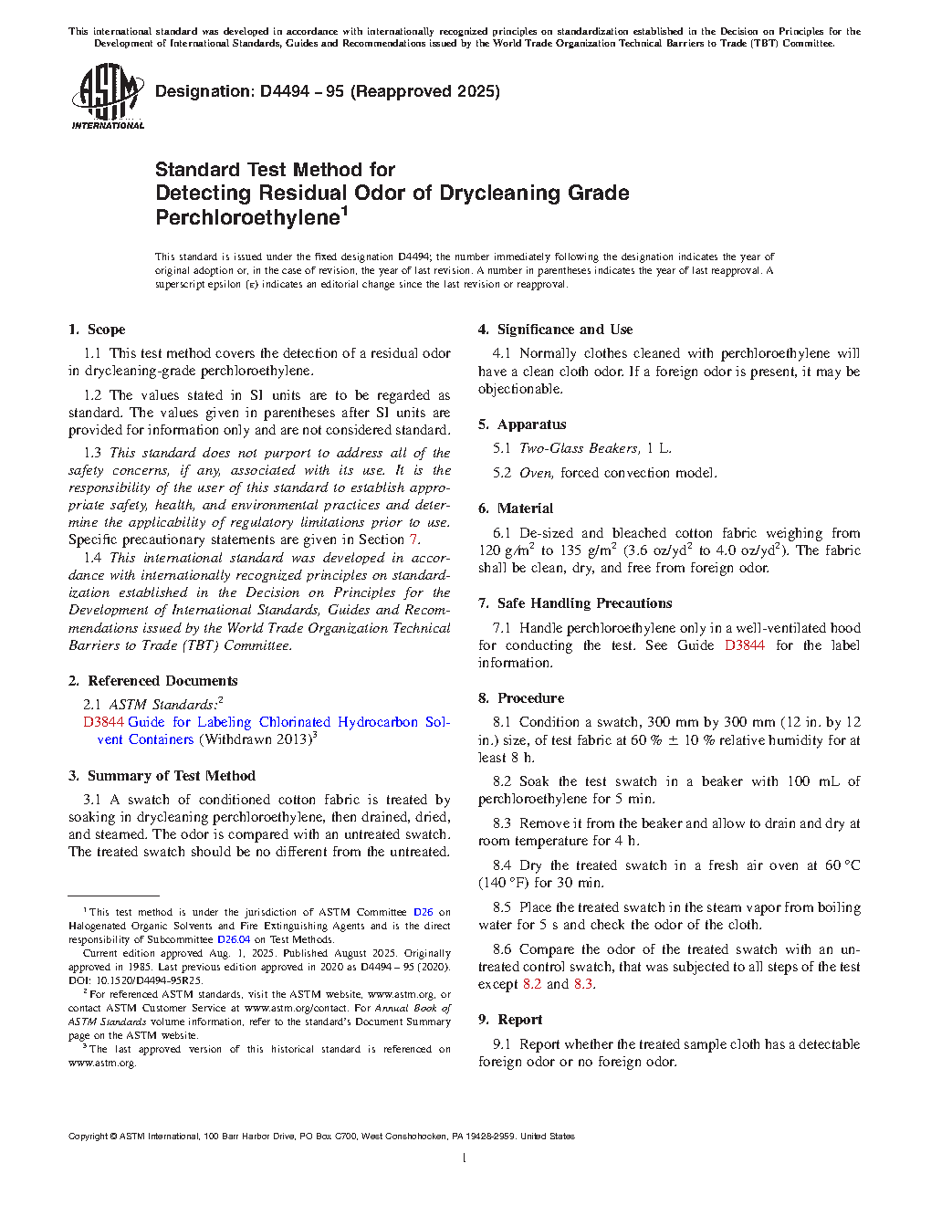 1.1 This test method covers the detection of a residual odor in drycleaning-grade perchloroethylene.
