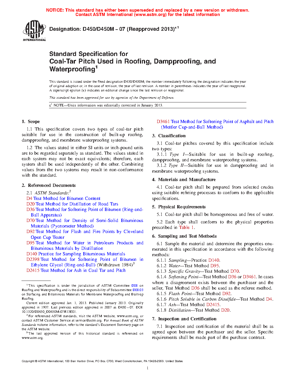 1.1 This specification covers two types of coal-tar pitch suitable for use in the construction of built-up roofing, dampproofing, and membrane waterproofing systems.