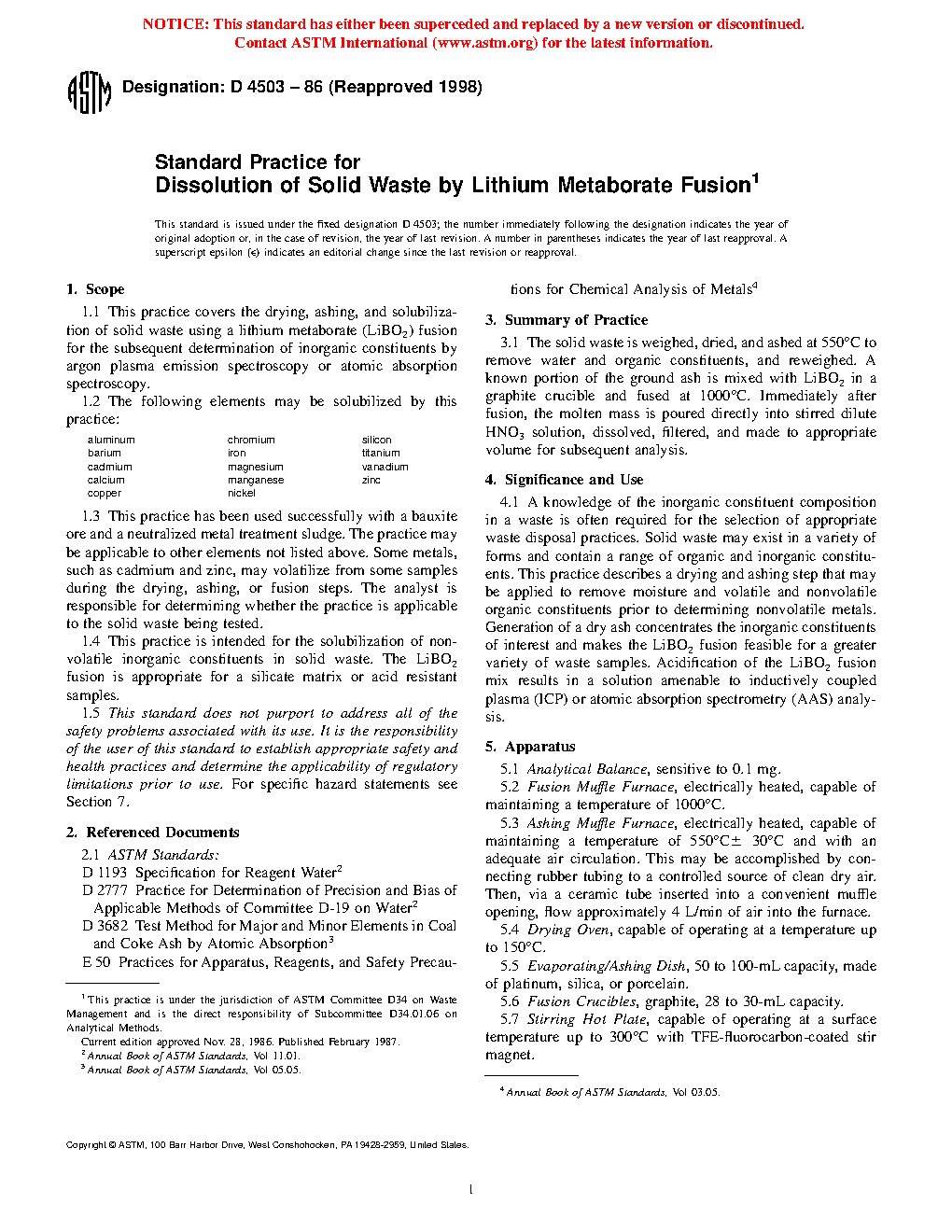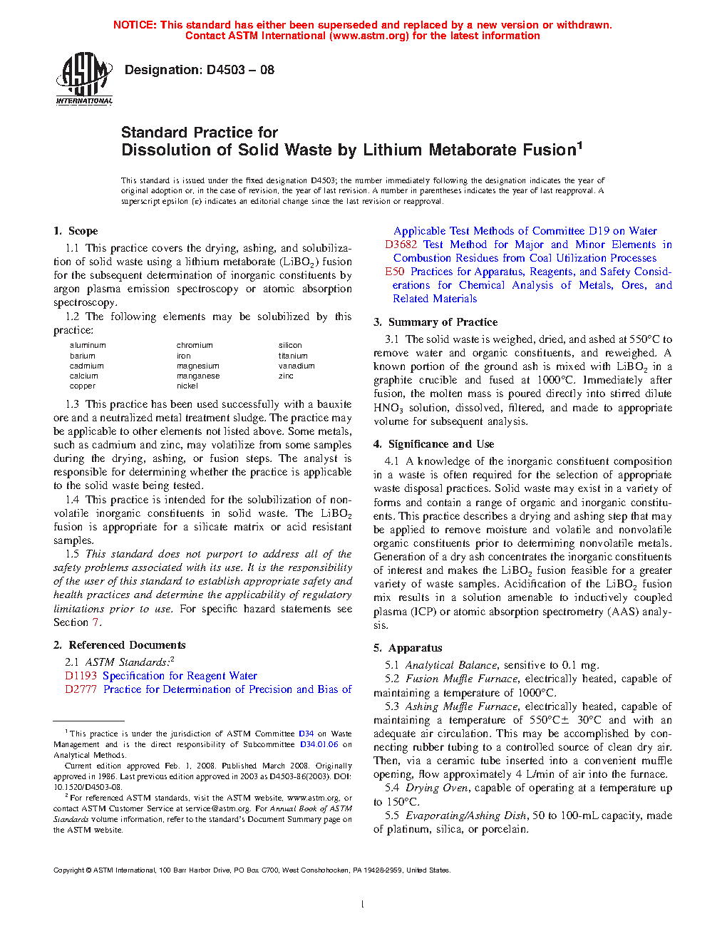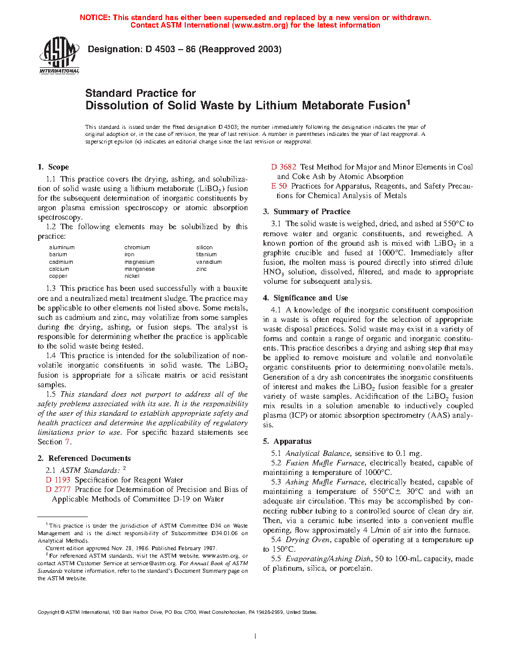 1.1 This practice covers the drying, ashing, and solubilization of solid waste using a lithium metaborate (LiBO2) fusion for the subsequent determination of inorganic constituents by argon plasma emission spectroscopy or atomic absorption spectroscopy.