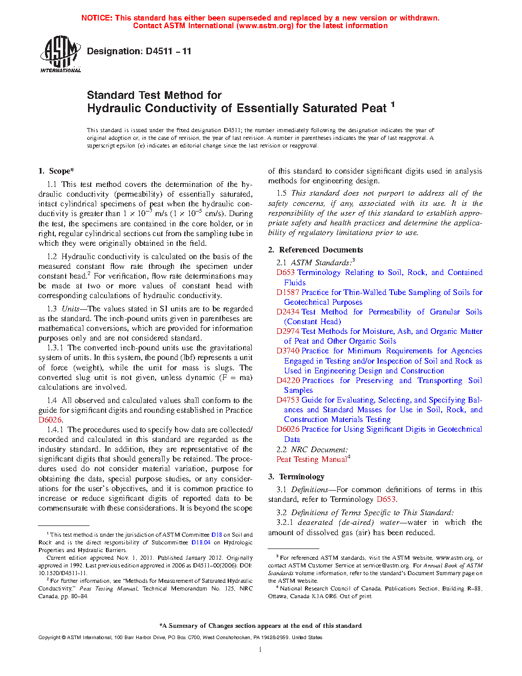 1.1 This test method covers the determination of the hydraulic conductivity (permeability) of essentially saturated, intact cylindrical specimens of peat when the hydraulic conductivity is greater than 1 10-7 m/s (1 10-5 cm/s). During the test, the specimens are contained in the core holder, or in right, regular cylindrical sections cut from the sampling tube in which they were originally obtained in the field.