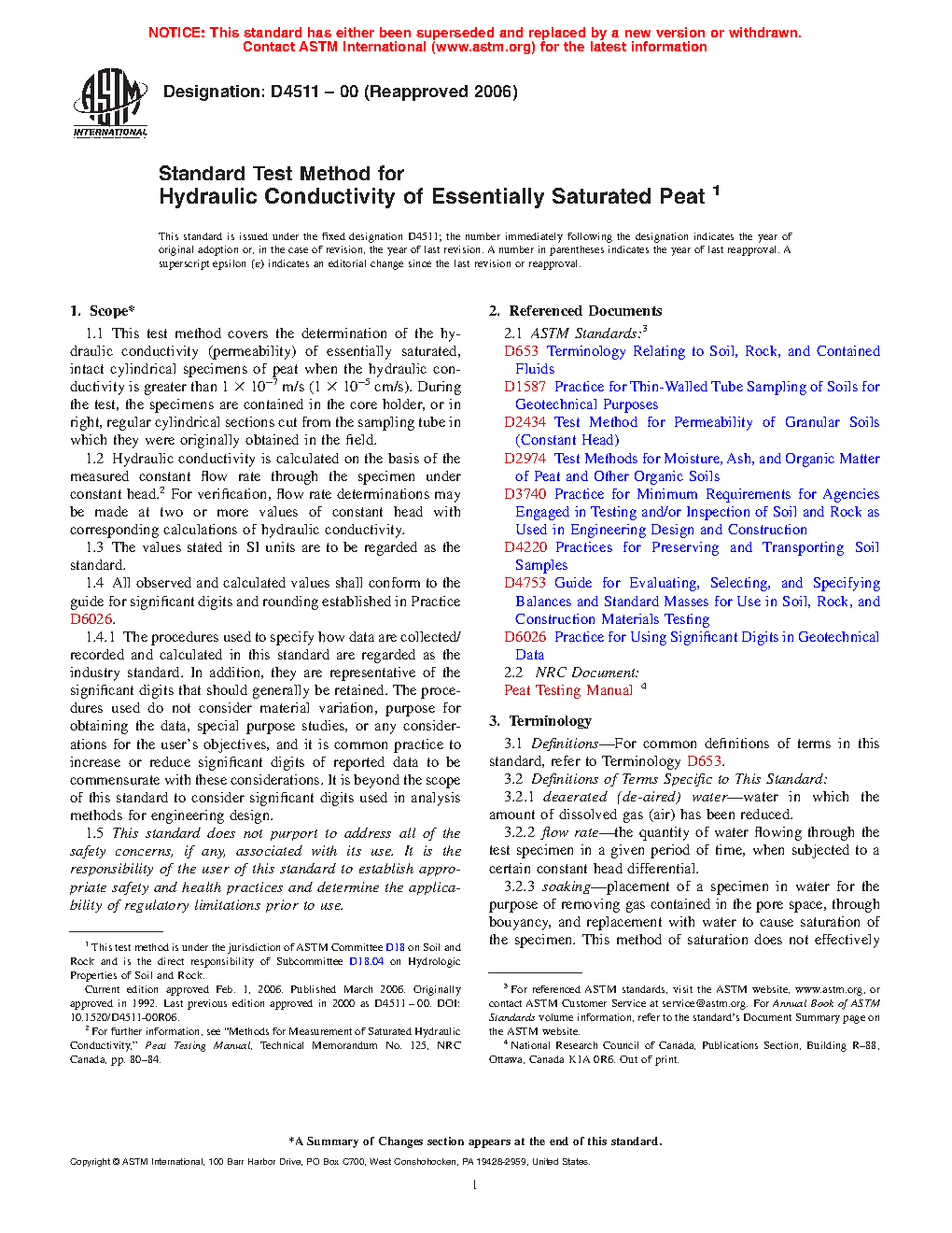 4.2 Even under light, sustained loads, peat will undergo dramatic volume changes that influence (decrease) the hydraulic conductivity of the deposit by several orders of magnitude. This test method does not offer provisions for the determination of the relationship between hydraulic conductivity and the void ratios corresponding to increasing stress levels. Therefore, this test method is not suitable for applications involving grade increases, such as embankment construction or placement of access berms alongside drainage ditches.