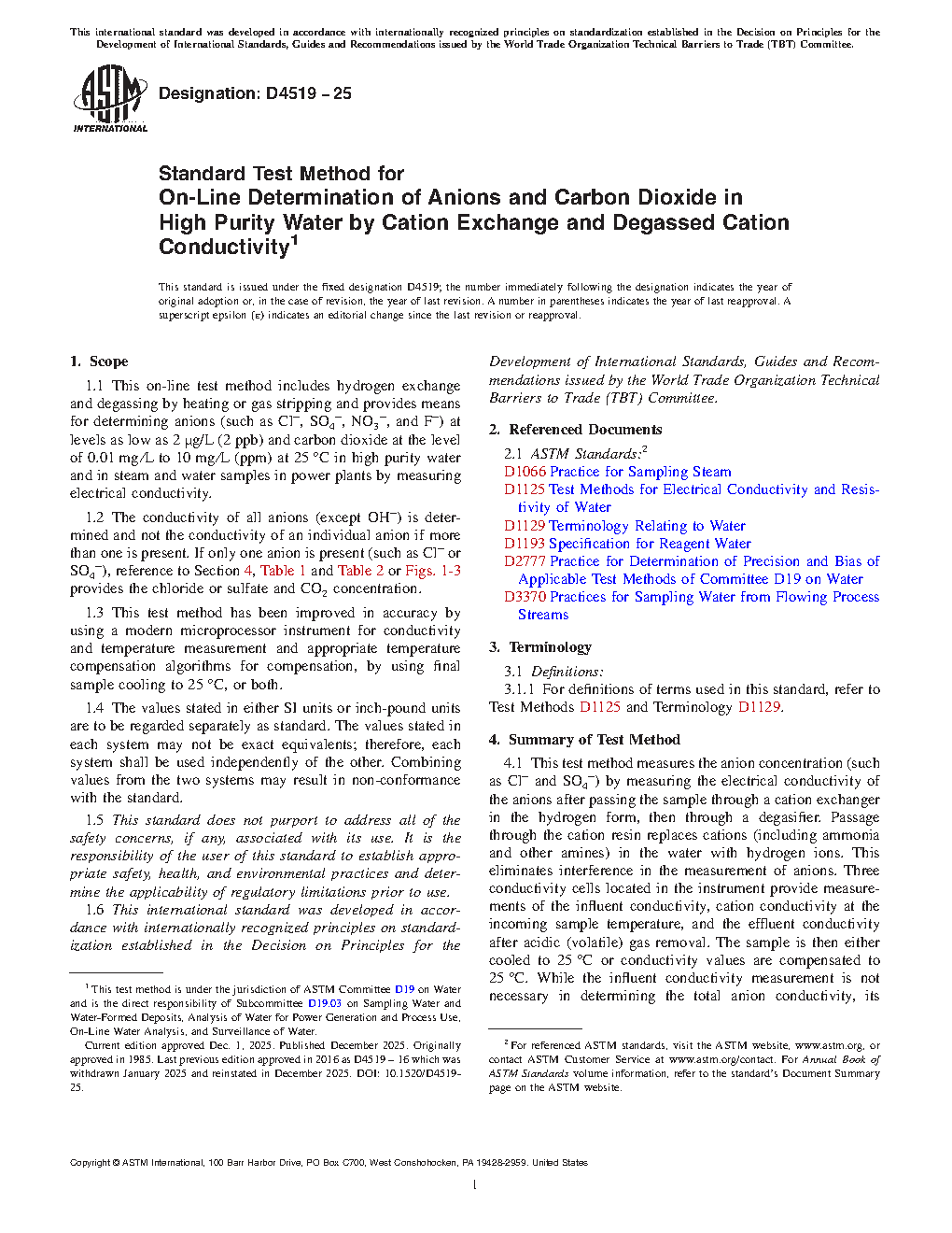 1.1 This on-line test method includes hydrogen exchange and degassing by heating or gas stripping and provides means for determining anions (such as Cl−, SO4—, NO3−, and F−) at levels as low as 2 μg/L (2 ppb) and carbon dioxide at the level of 0.01 to 10 mg/L (ppm) at 25°C in high purity water and in steam and water samples in power plants by measuring electrical conductivity.