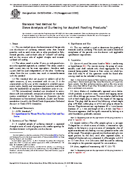 1.1 This test method covers the determination of the particle size distribution of surfacing material, other than mineral granules, such as sand, mica, talc, or other powdered or flaky mineral particles, used on both sides of “smooth” roll roofing and on the reverse side of asphalt shingles and mineral-surfaced roll roofing.