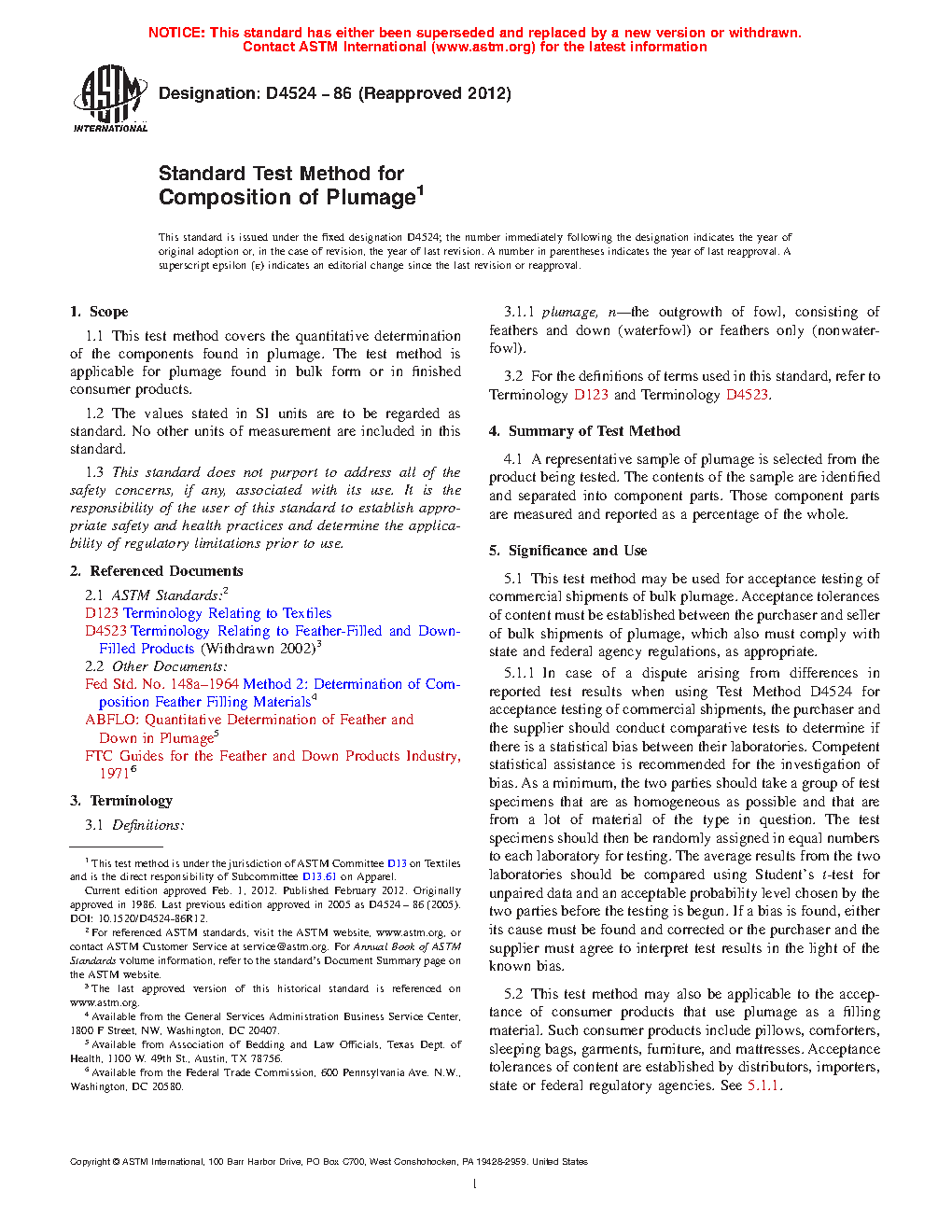 1.1 This test method covers the quantitative determination of the components found in plumage. The test method is applicable for plumage found in bulk form or in finished consumer products.