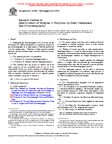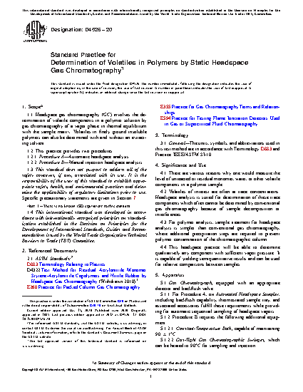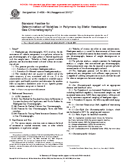1.1 Headspace gas chromatography (GC) involves the determination of volatile components in a polymer solution by gas chromatography of a vapor phase in thermal equilibrium with the sample matrix. Volatiles in finely ground insoluble polymers can also be determined with and without an extracting solvent.