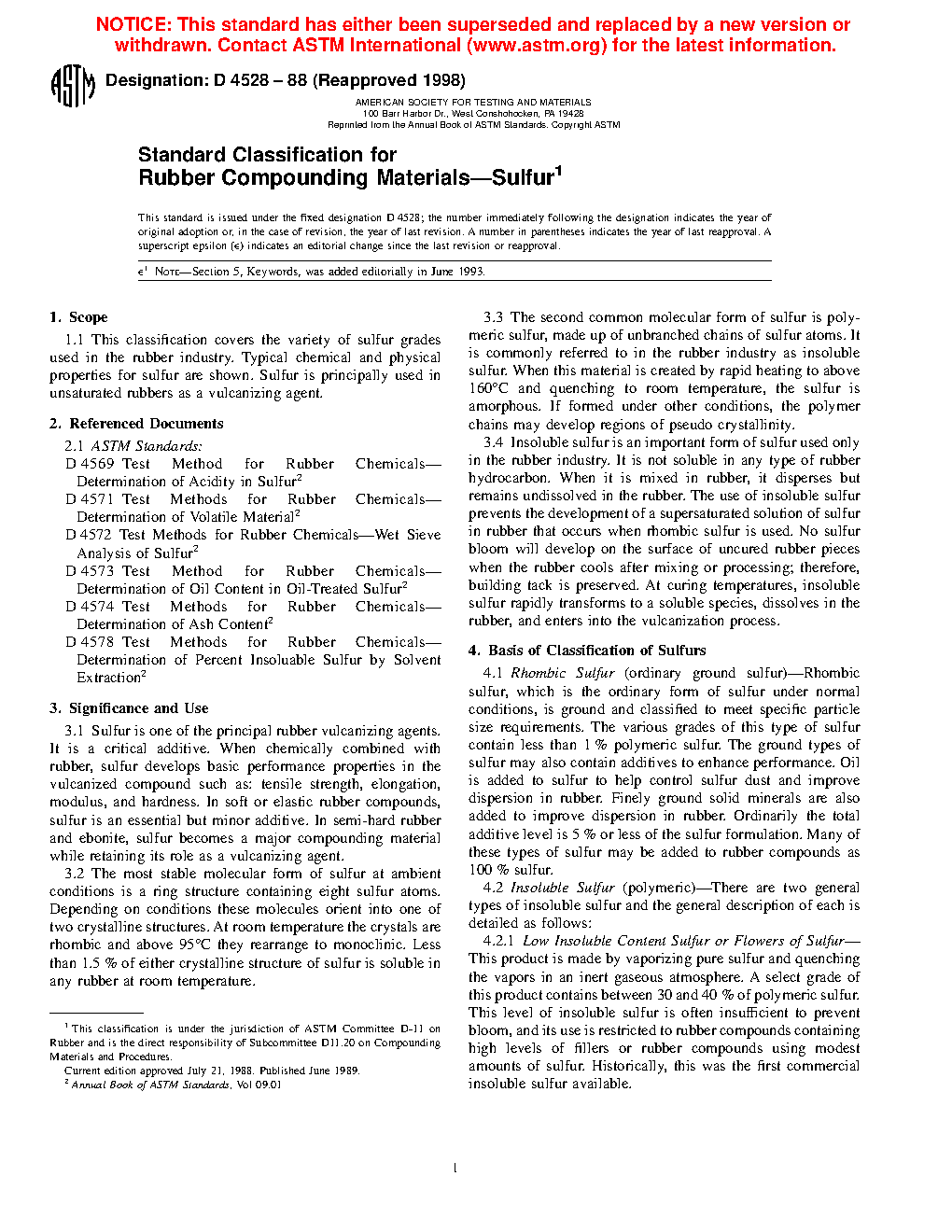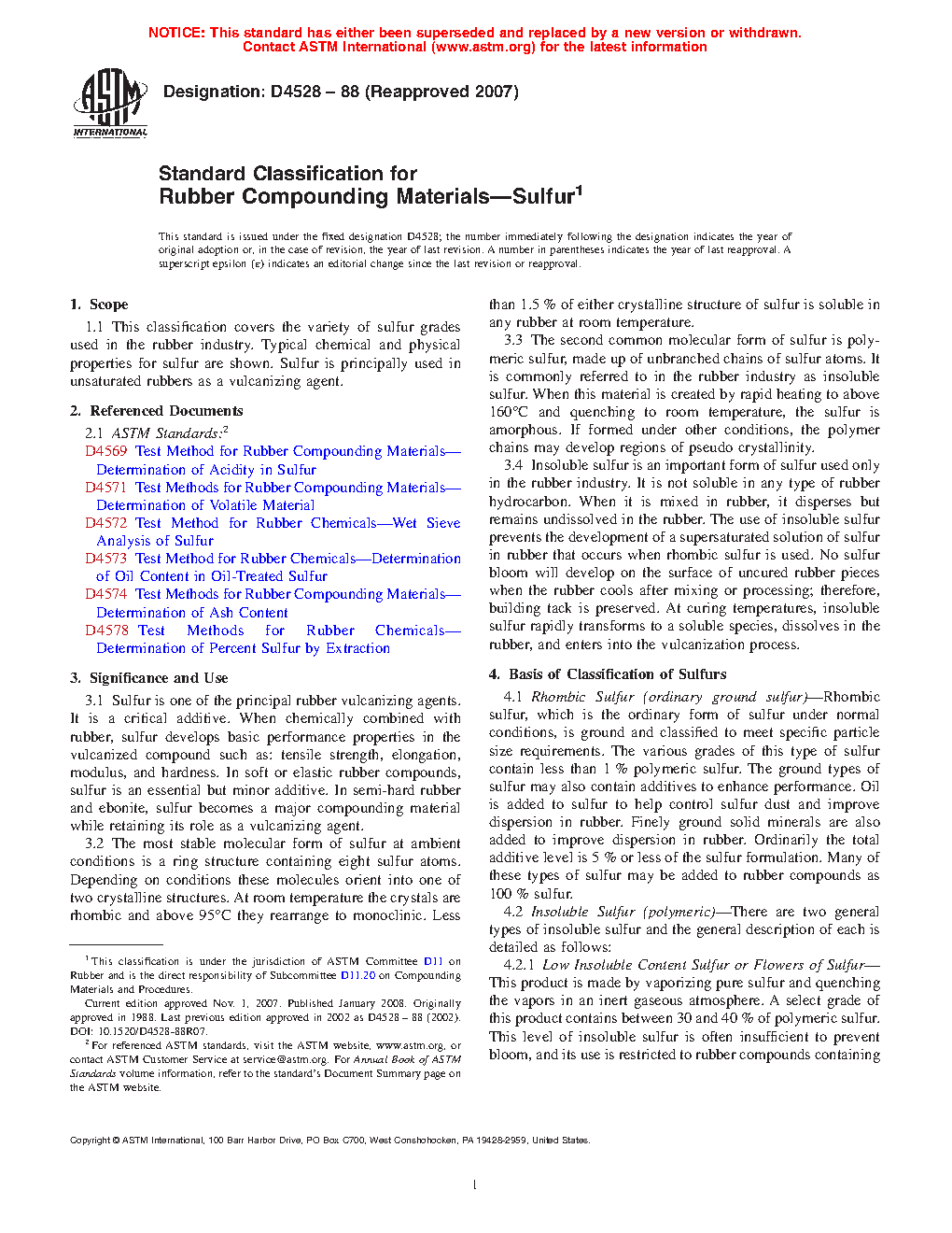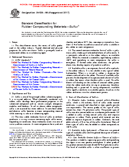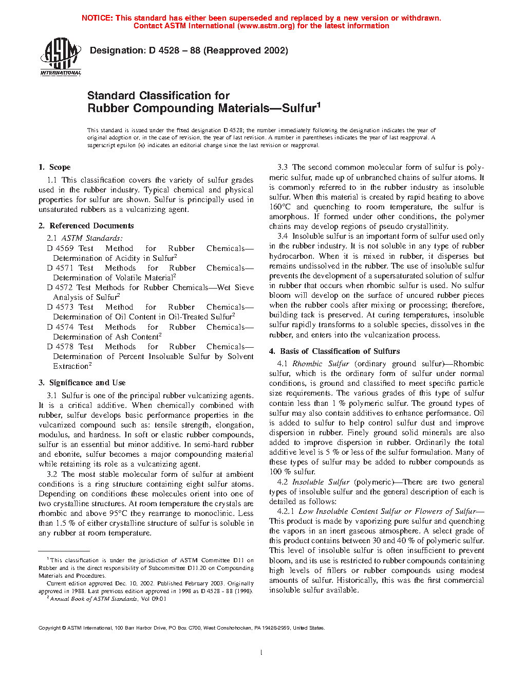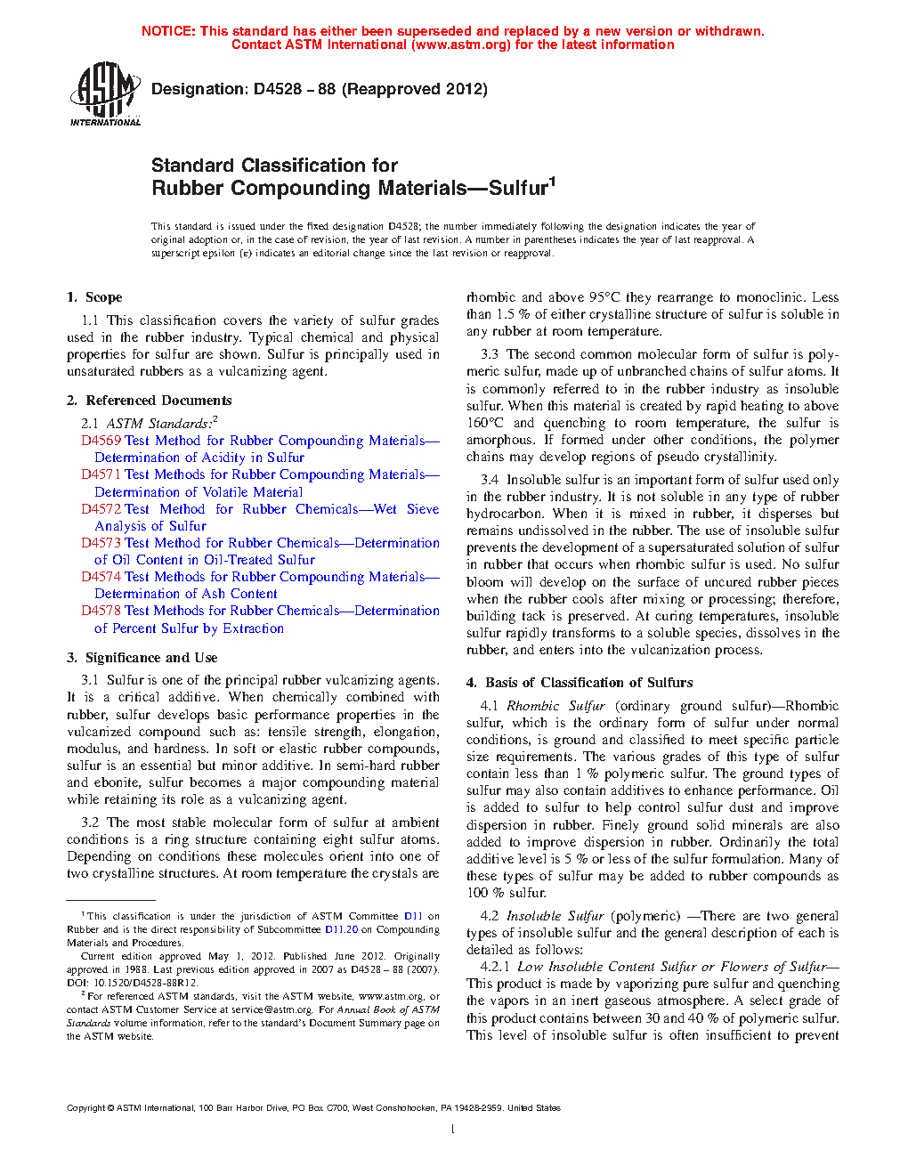 1.1 This classification covers the variety of sulfur grades used in the rubber industry. Typical chemical and physical properties for sulfur are shown. Sulfur is principally used in unsaturated rubbers as a vulcanizing agent.