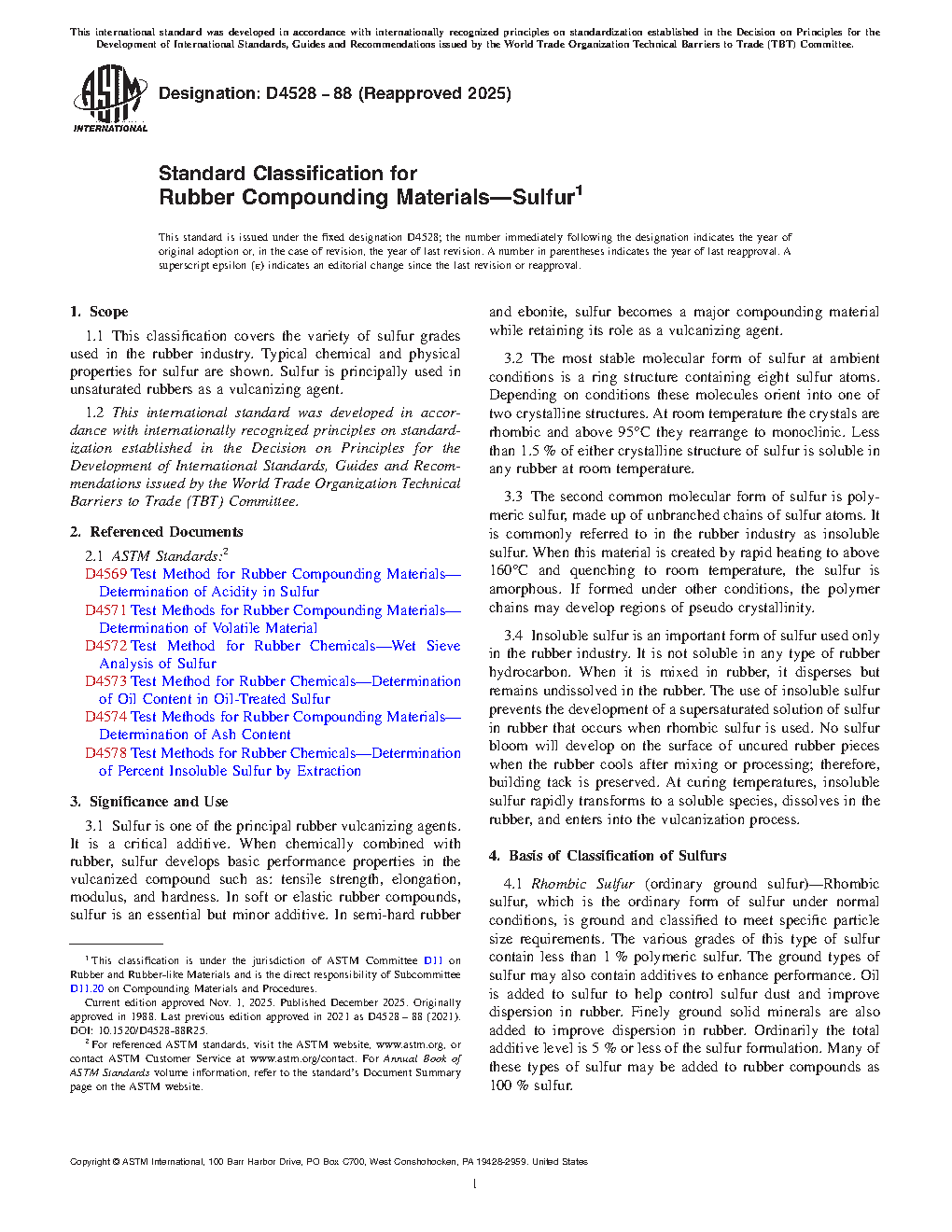 1.1 This classification covers the variety of sulfur grades used in the rubber industry. Typical chemical and physical properties for sulfur are shown. Sulfur is principally used in unsaturated rubbers as a vulcanizing agent.