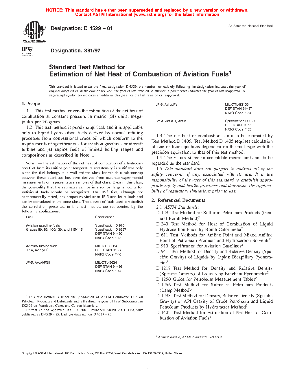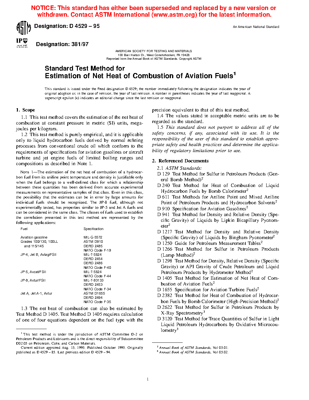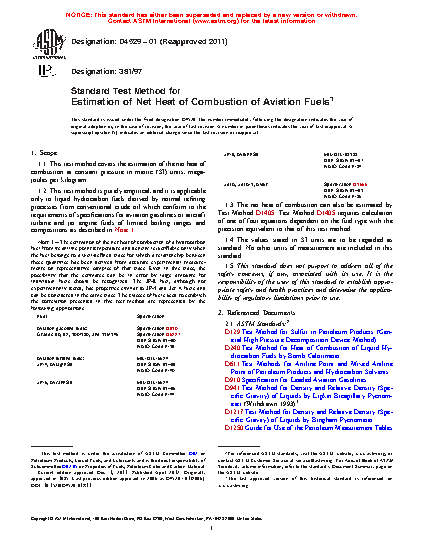 1.3 The net heat of combustion can also be estimated by Test Methods D1405 or D3338. Test Method D1405 requires calculation of one of four equations dependent on the fuel type with the precision equivalent to that of this test method, whereas Test Method D3338 requires calculation of a single equation for aviation fuel with a precision equivalent to that test method.