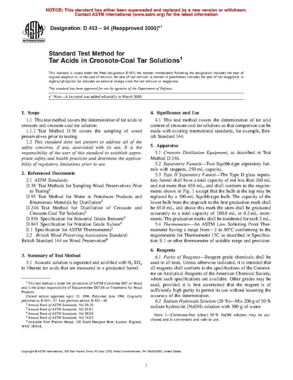 Standard Test Method for Tar Acids in Creosote-Coal Tar Solutions (Withdrawn 2006)