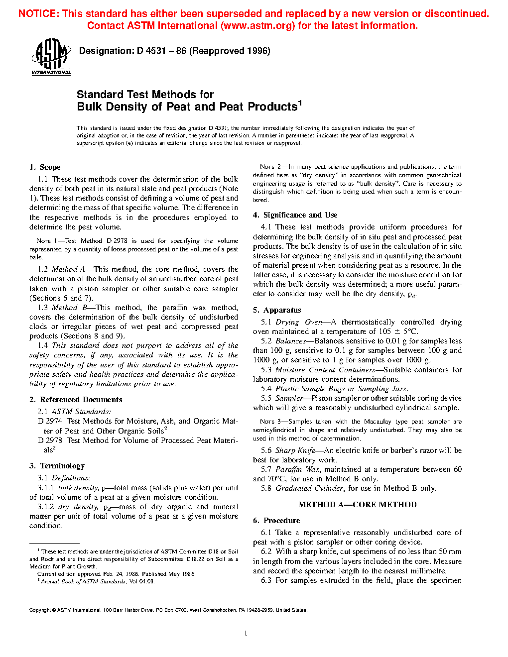 1.2 Method A—This method, the core method, covers the determination of the bulk density of an undisturbed core of peat taken with a piston sampler or other suitable core sampler (Sections 6 and 7).