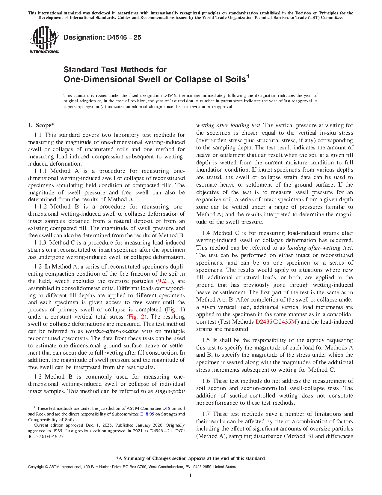 1.2 The test methods can be used to measure the magnitude of one-dimensional wetting-induced swell or collapse (hydrocompression) under different vertical (axial) pressures, as well as the magnitude of swell pressure and the magnitude of free swell. It can also be used to obtain data for stress-induced compression following wetting-induced swell or collapse.