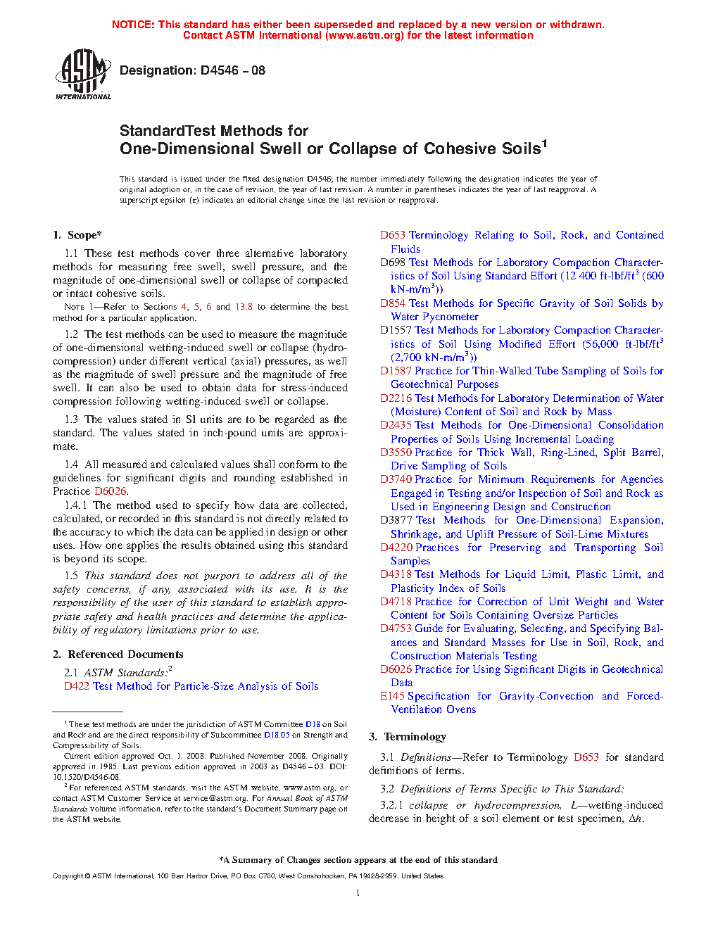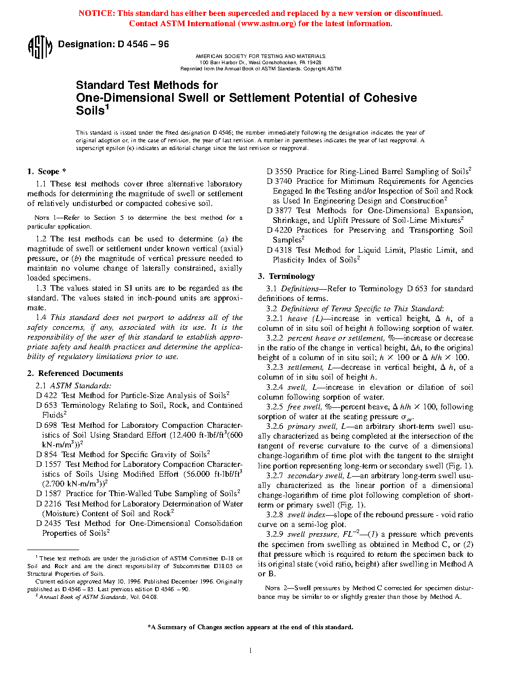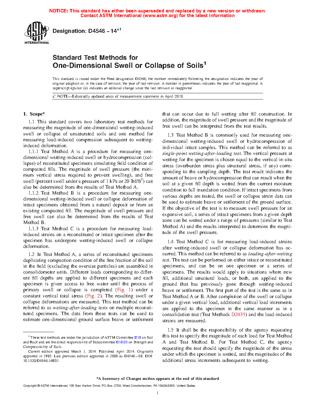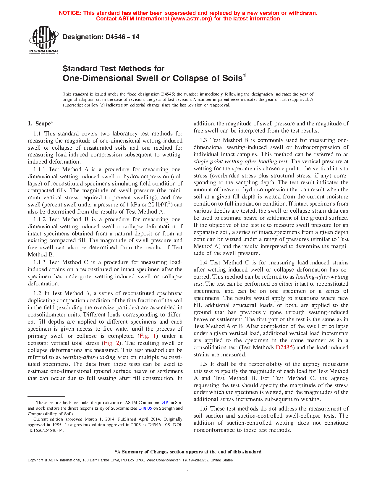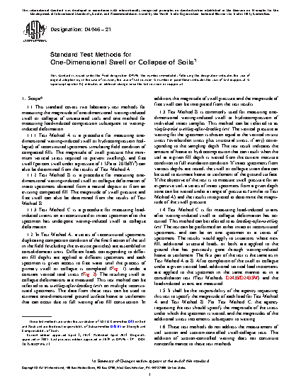 1.1.2 Test Method B is a procedure for measuring one-dimensional wetting-induced swell or collapse deformation of intact specimens obtained from a natural deposit or from an existing compacted fill. The magnitude of swell pressure and free swell can also be determined from the results of Test Method B.