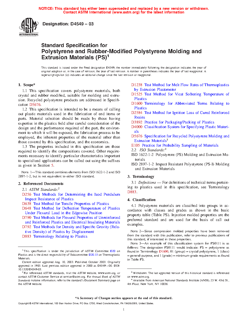This specification, which covers polystyrene materials, both crystal and rubber modified suitable for molding and extrusion, is intended to be a means of calling out plastic materials used in the fabrication of end items or parts. Polystyrene materials are classified according to classes after being grouped as crystal, rubber modified, and others. The materials are further classified according to grades after being grouped as general-purpose, other medium impact, high impact, super-high-impact, and others. The materials shall conform to the prescribed injection molded properties and natural colors.