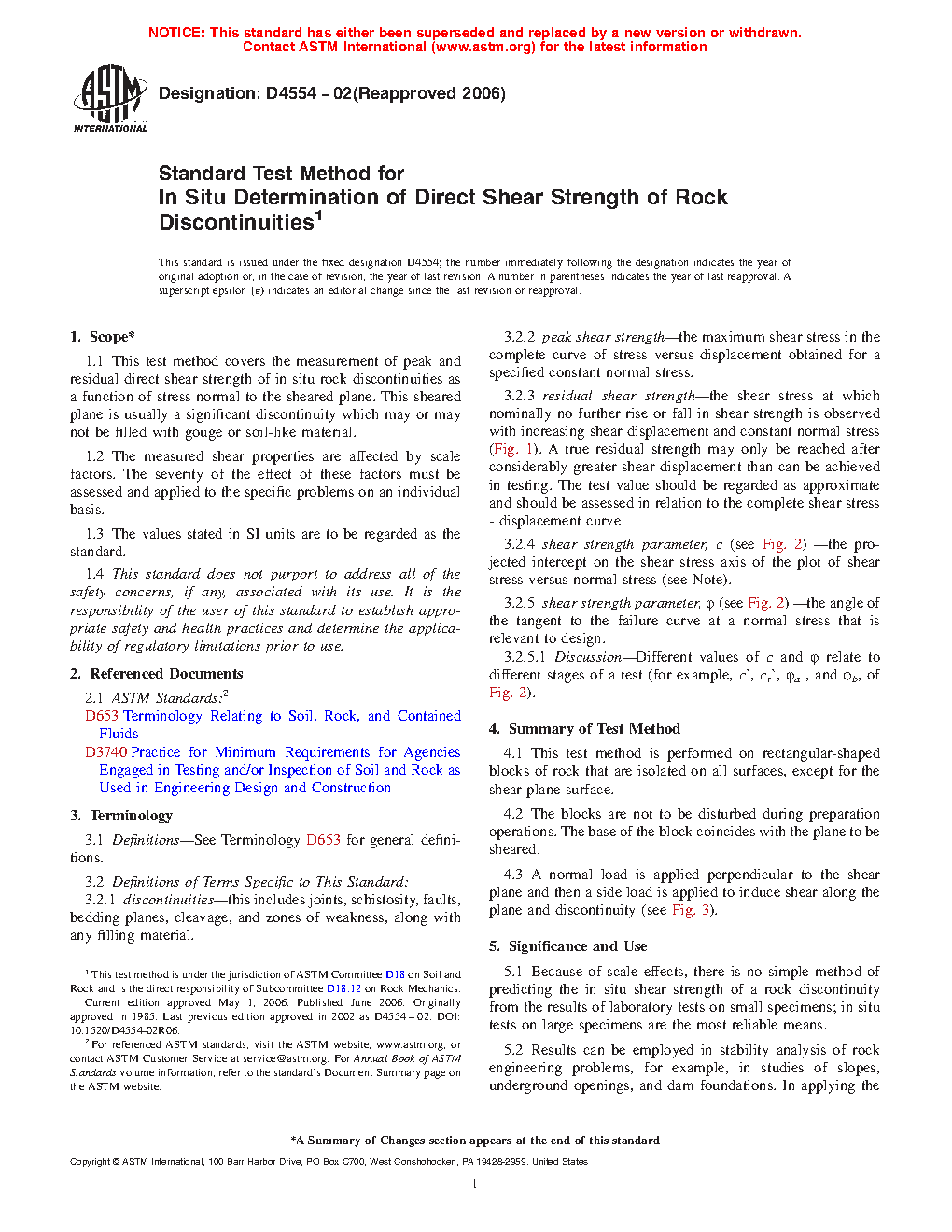 5.1 Because of scale effects, there is no simple method of predicting the in situ shear strength of a rock discontinuity from the results of laboratory tests on small specimens; in situ tests on large specimens are the most reliable means.