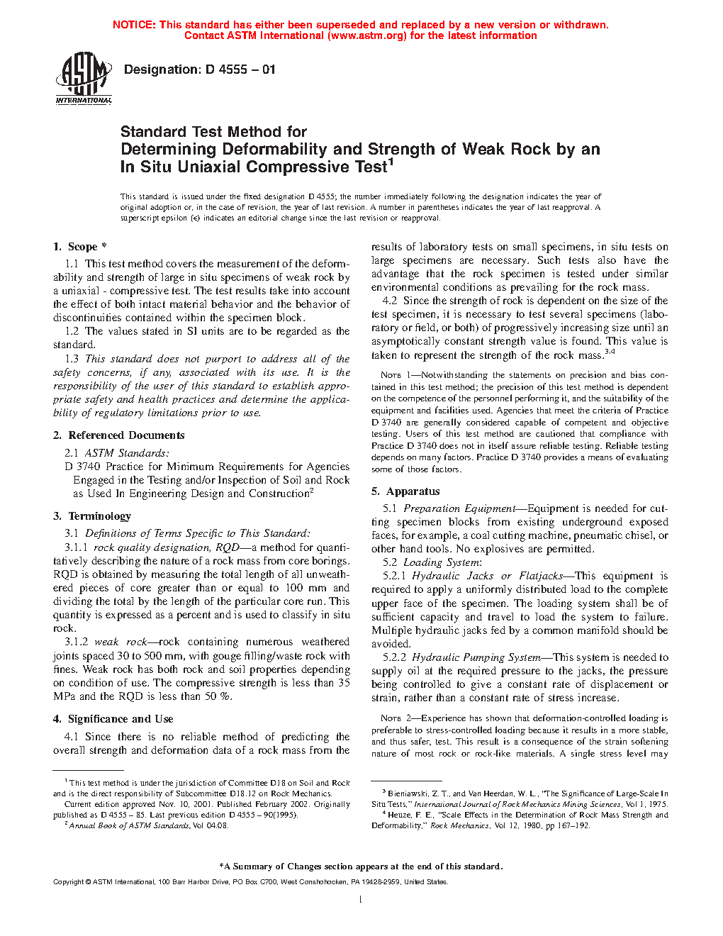 1.1 This test method covers the measurement of the deformability and strength of large in situ specimens of rock by a uniaxial compressive test. The test results take into account the effect of both intact material behavior and the behavior of discontinuities contained within the specimen block.