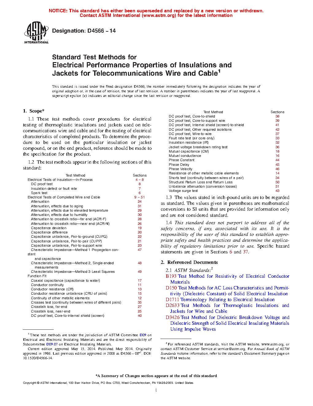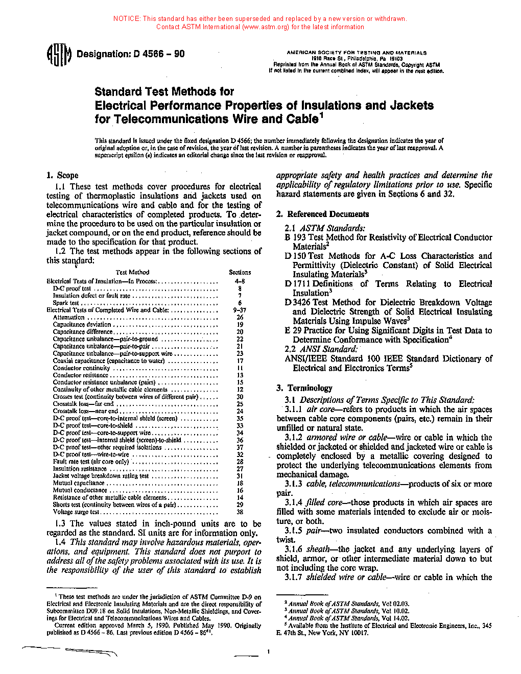 1.1 These test methods cover procedures for electrical testing of thermoplastic insulations and jackets used on telecommunications wire and cable and for the testing of electrical characteristics of completed products. To determine the procedure to be used on the particular insulation or jacket compound, or on the end product, reference should be made to the specification for the product.