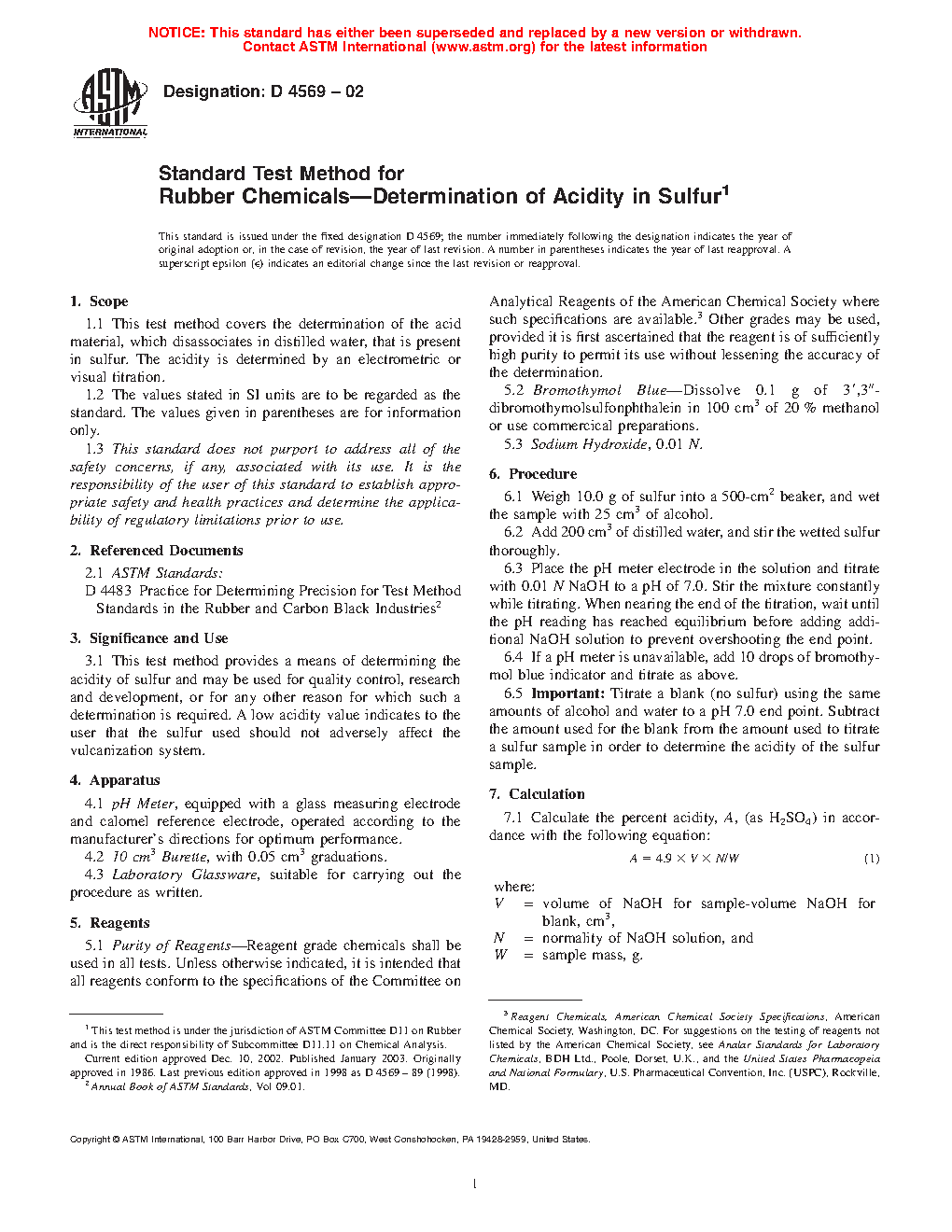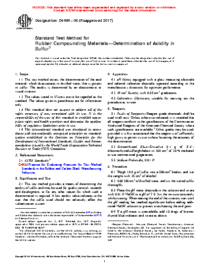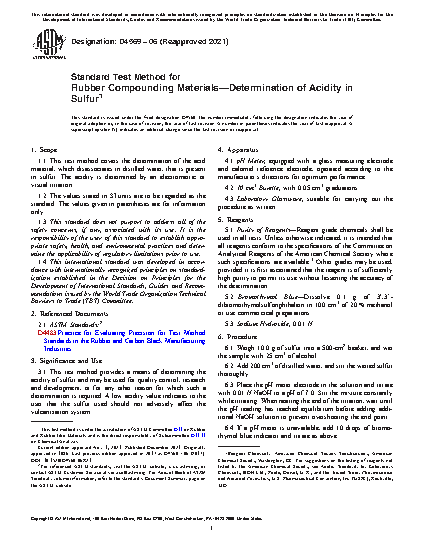 This test method provides a means of determining the acidity of sulfur and may be used for quality control, research and development, or for any other reason for which such a determination is required. A low acidity value indicates to the user that the sulfur used should not adversely affect the vulcanization system.