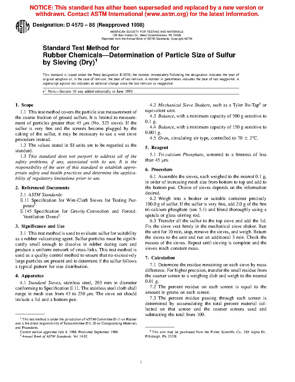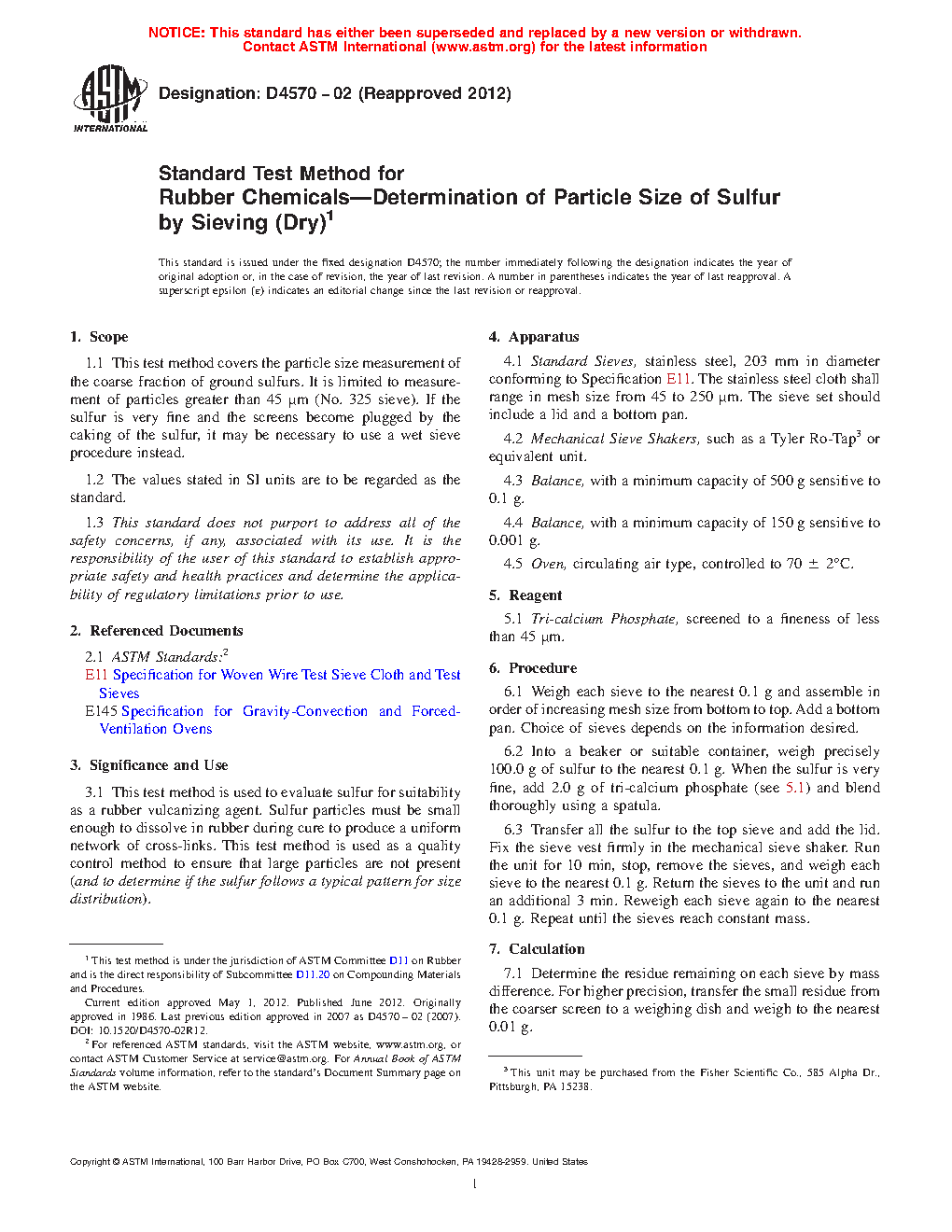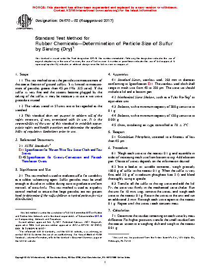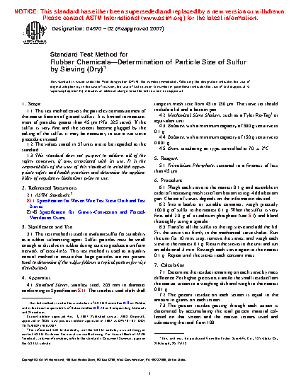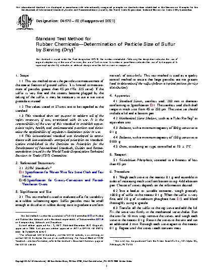 This test method is used to evaluate sulfur for suitability as a rubber vulcanizing agent. Sulfur particles must be small enough to dissolve in rubber during cure to produce a uniform network of cross-links. This test method is used as a quality control method to ensure that large particles are not present (and to determine if the sulfur follows a typical pattern for size distribution).