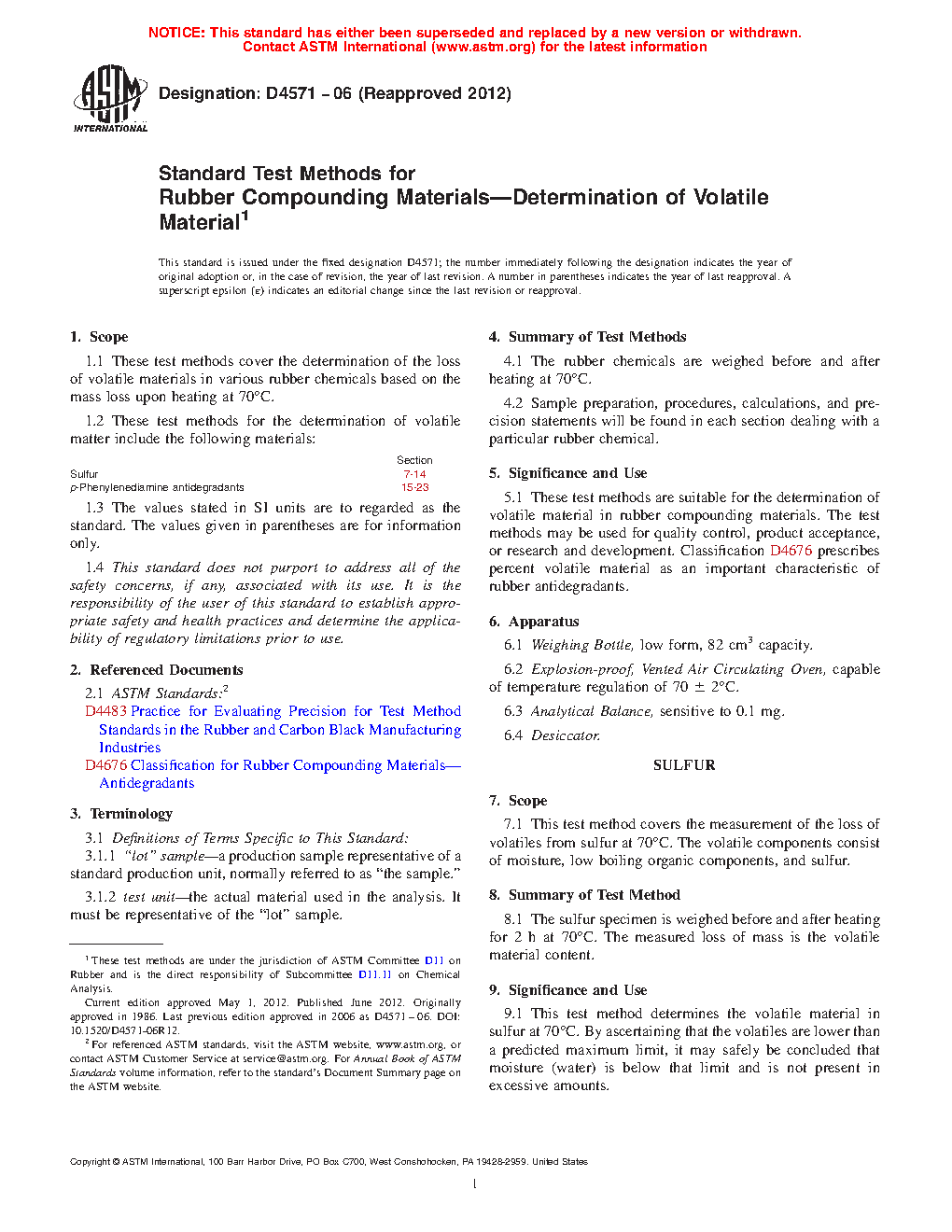 5.1 These test methods are suitable for the determination of volatile material in rubber compounding materials. The test methods may be used for quality control, product acceptance, or research and development. Classification D4676 prescribes percent volatile material as an important characteristic of rubber antidegradants.
