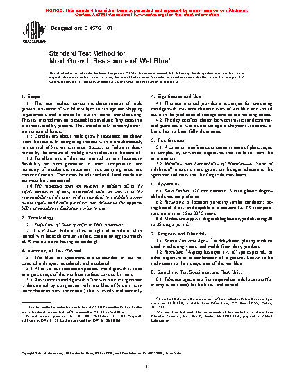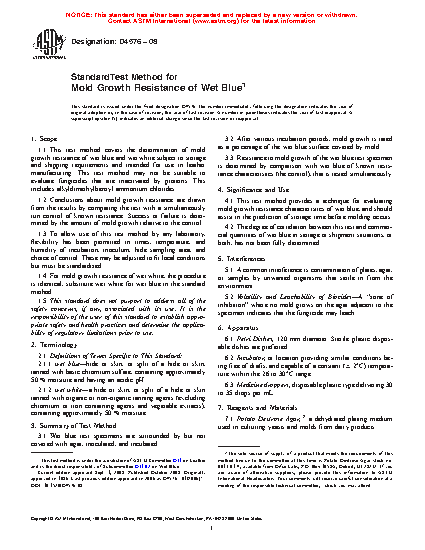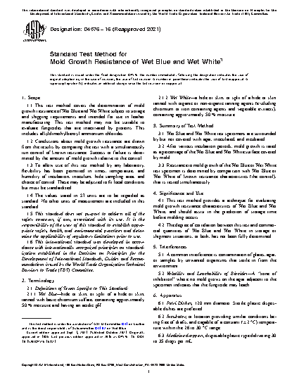 1.1 This test method covers the determination of mold growth resistance of wet blue subject to storage and shipping requirements and intended for use in leather manufacturing. This test method may not be suitable to evaluate fungicides that are inactivated by proteins. This includes alkyldimethylbenzyl ammonium chlorides.
