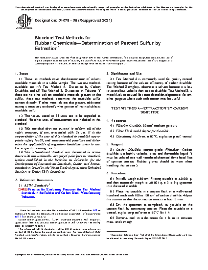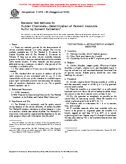 1.1 These test methods cover the determination of solvent insoluble materials in a sulfur sample. The two test methods available are: (1) Test Method A, Extraction by Carbon Disulfide, and (2) Test Method B, Extraction by Toluene. If there are no other solvent insoluble materials present in the sulfur, these test methods determine the insoluble sulfur content directly. If other materials are also present, additional testing is necessary to identify what portion of the insolubles is insoluble sulfur.