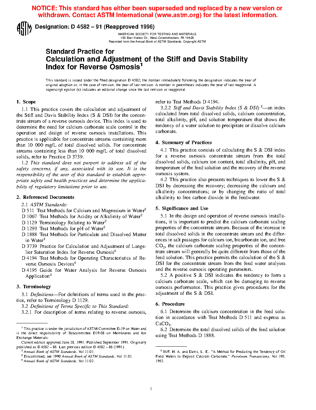 1.1 This practice covers the calculation and adjustment of the Stiff and Davis Stability Index (S & DSI) for the concentrate stream of a reverse osmosis device. This index is used to determine the need for calcium carbonate scale control in the operation and design of reverse osmosis installations. This practice is applicable for concentrate streams containing more than 10 000 mg/L of total dissolved solids. For concentrate streams containing less than 10 000 mg/L of total dissolved solids, refer to Practice D3739.