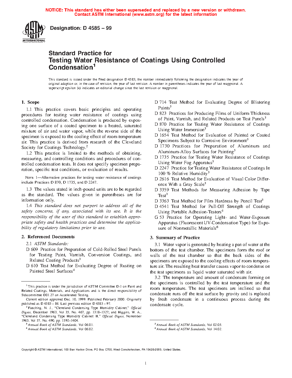 1.1 This practice covers basic principles and operating procedures for testing water resistance of coatings using controlled condensation. Condensation is produced by exposing one surface of a coated specimen to a heated, saturated mixture of air and water vapor, while the reverse side of the specimen is exposed to the cooling effect of room temperature air. This practice is derived from research of the Cleveland Society for Coatings Technology.