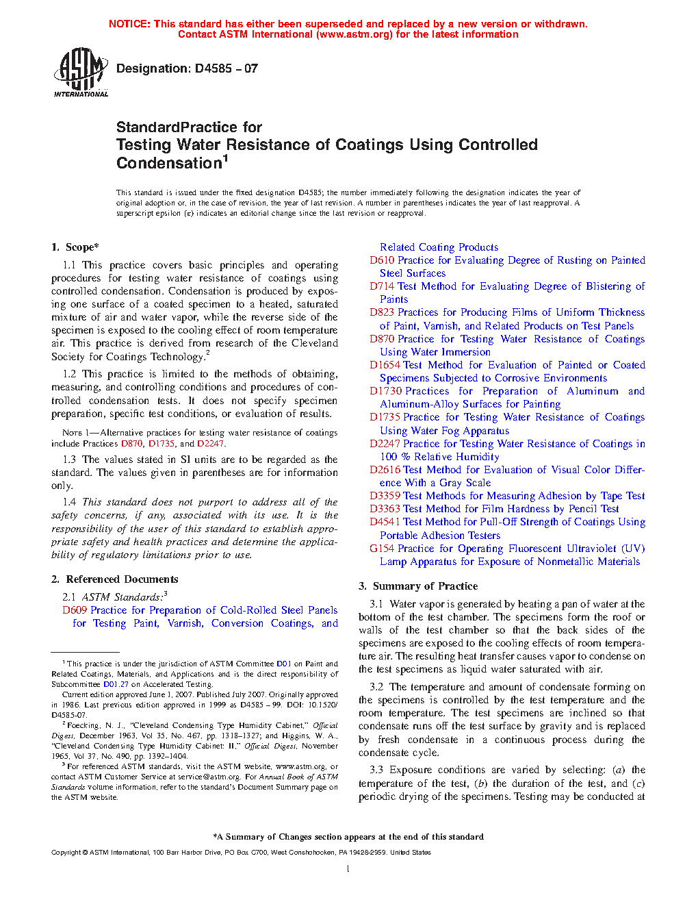 1.1 This practice covers basic principles and operating procedures for testing water resistance of coatings using controlled condensation. Condensation is produced by exposing one surface of a coated specimen to a heated, saturated mixture of air and water vapor, while the reverse side of the specimen is exposed to the cooling effect of room temperature air. This practice is derived from research of the Cleveland Society for Coatings Technology.2