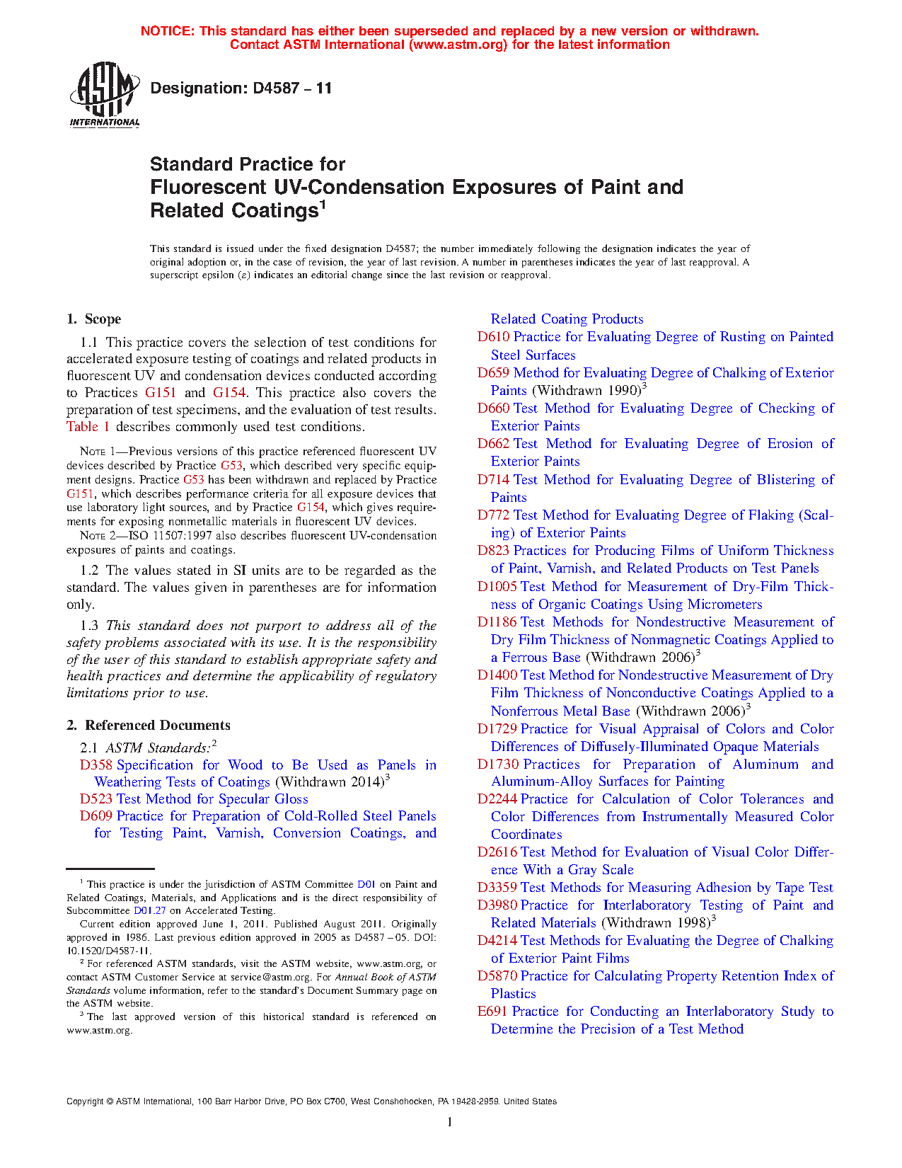 1.1 This practice covers the selection of test conditions for accelerated exposure testing of coatings and related products in fluorescent UV and condensation devices conducted according to Practices G151 and G154. This practice also covers the preparation of test specimens, and the evaluation of test results. Table 1 describes commonly used test conditions.