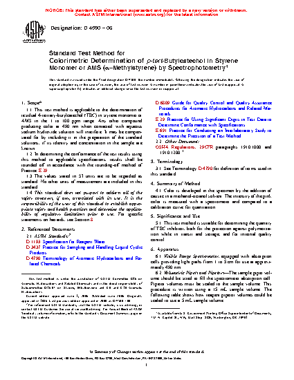 1.1 This test method is applicable to the determination of residual 4-tertiary-butylcatechol (TBC) in styrene monomer or AMS in the 1 to 100 ppm range. Any other compound known to produce color when contacted with aqueous sodium hydroxide solution will interfere. It may be compensated for by including it in the preparation of the standard solutions, if its identity and concentration in the sample are known.