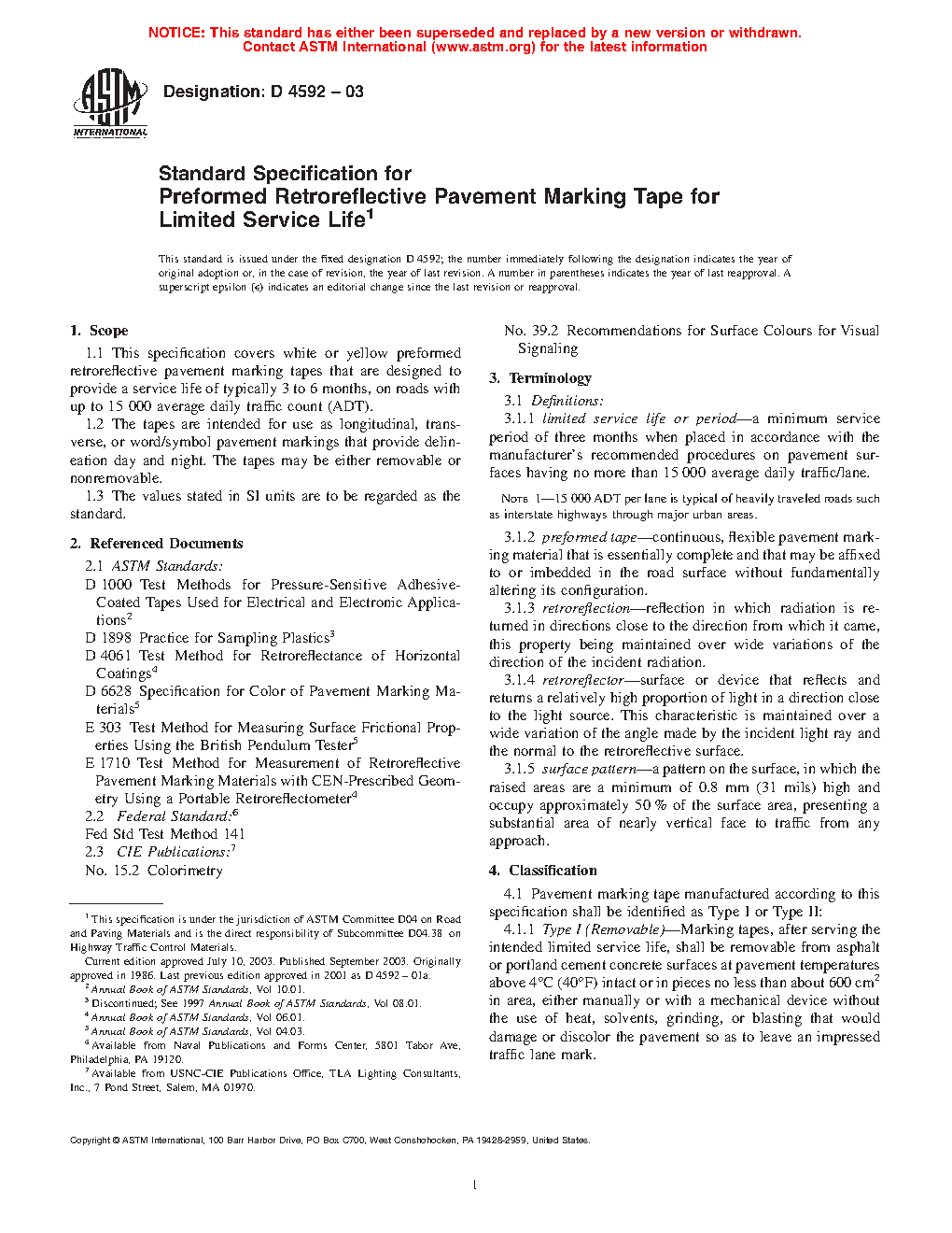 1.1 This specification covers white or yellow preformed retroreflective pavement marking tapes that are designed to provide a service life of typically three to six months, depending on wear and durability factors.