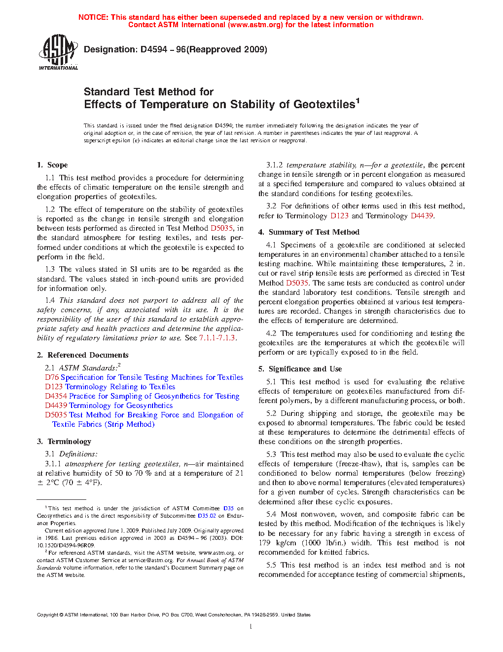 1.2 The effect of temperature on the stability of geotextiles is reported as the change in tensile strength and elongation between tests performed as directed in Test Method D5035, in the standard atmosphere for testing textiles, and tests performed under conditions at which the geotextile is expected to perform in the field.