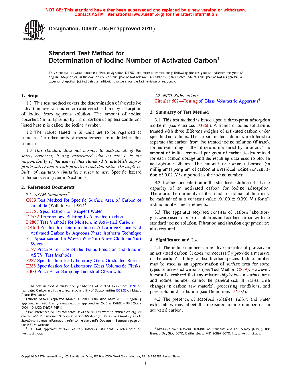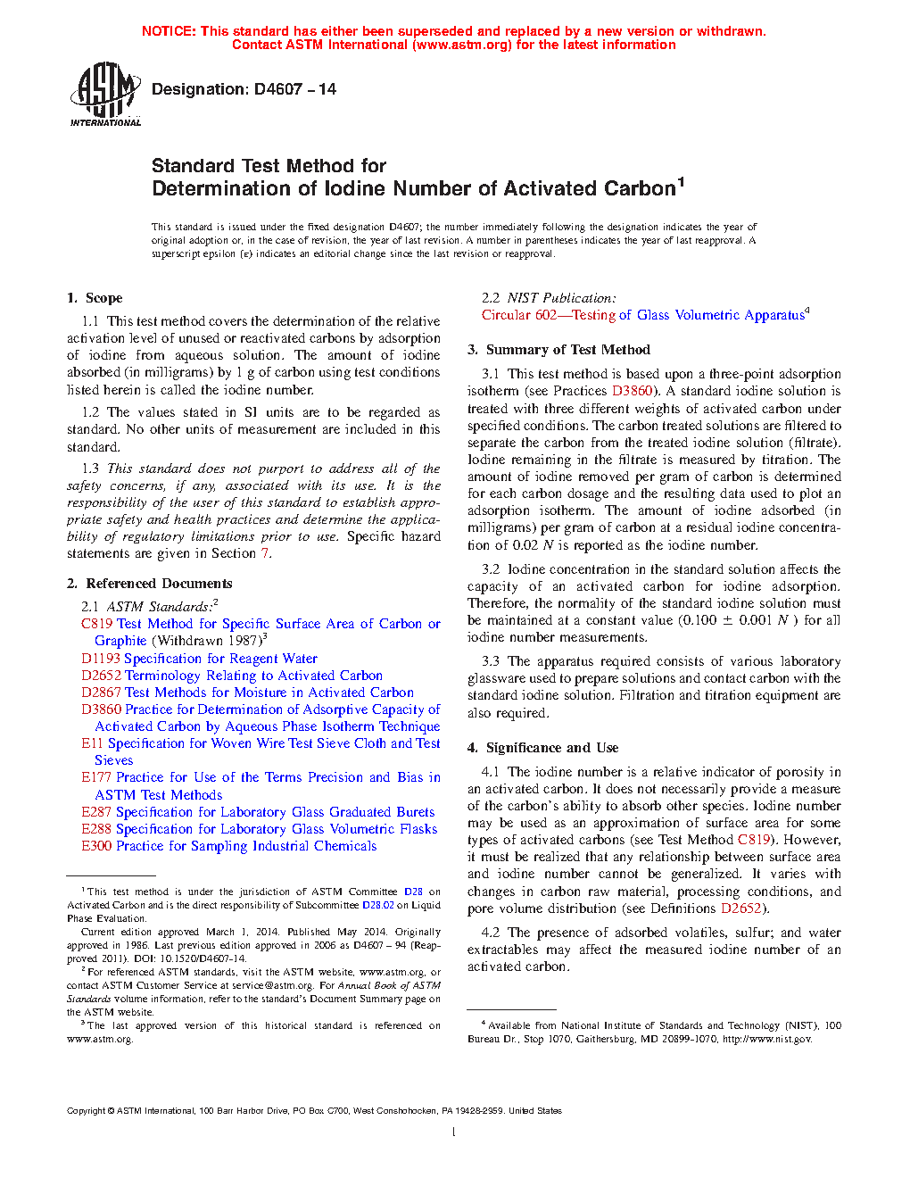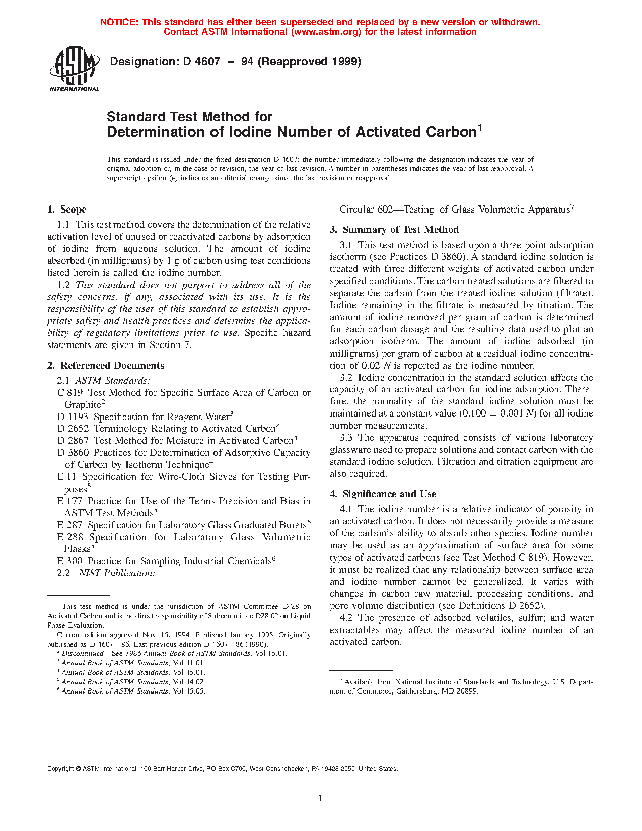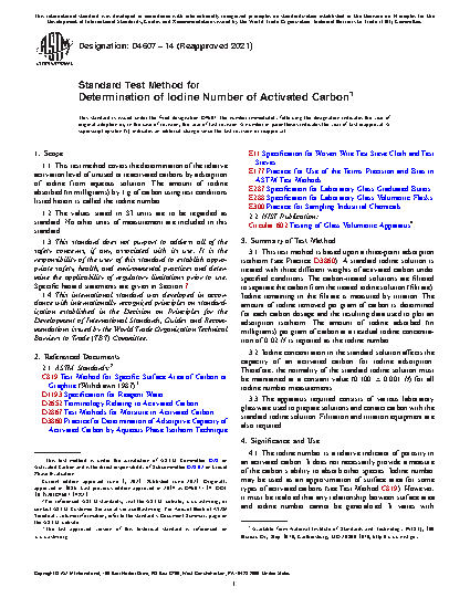 1.1 This test method covers the determination of the relative activation level of unused or reactivated carbons by adsorption of iodine from aqueous solution. The amount of iodine absorbed (in milligrams) by 1 g of carbon using test conditions listed herein is called the iodine number.